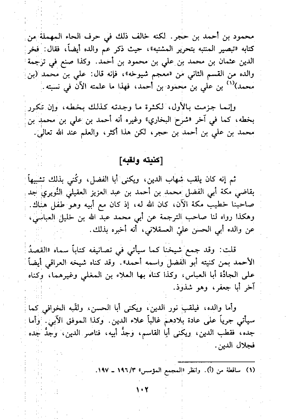 محمود بن أحمد بن حجر. لكنه خالف ذلك في حرف الحاء المهملة من كتابه "تبصير المنتبه بتحرير المشتبه"، حيث ذكر عم والده أيضًا، فقال: فخر الدين عثمان بن محمد بن علي بن محمود بن أحمد. وكذا صنع في ترجمة والده من القسم الثاني من "معجم شيوخه"، فإنه قال: علي بن محمد (بن محمد) (¬1) بن علي بن محمود بن أحمد، فهذا ما علمته الآن في نسبته.