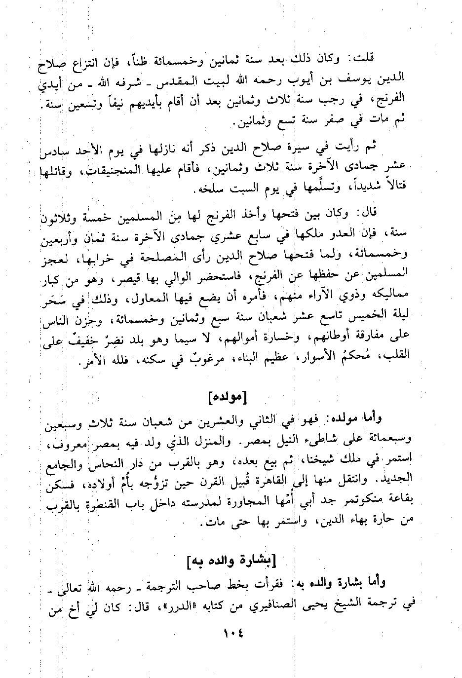 قلت: وكان ذلك بعد سنة ثمانين وخمسمائة ظنًّا، فإن انتزاع صلاح الدين يوسف بن أيوب رحمه اللَّه لبيت المقدس -شرفه اللَّه- من أيدي الفرنج، في رجب سنة ثلاث وثمانين بعد أن أقام بأيديهم نيفًا وتسعين سنة. ثم مات في صفر سنة تسع وثمانين.