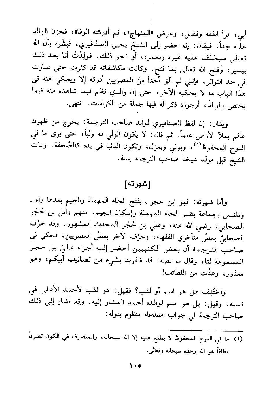 أبي، فرأ الفقه وفضل، وعرض "المنهاج"، ثم أدركته الوفاة، فحزن الوالد عليه جدًّا، فيقال: إنه حضر إلى الشيخ يحيى الصنَّافيري، فبشَّره بأن اللَّه تعالى سيخلف عليه غيره ويعمره، أو نحو ذلك. فولِدْتُ أنا بعد ذلك بيسير، وفتح اللَّه تعالى بما فتح. وكانت مكاشفاته قد كثرت حتى صارت في حد التواتر، فإنني لم ألق أحدًا مِنَ المصريين أدركه إلا ويحكي عنه في هذا الباب ما لا يحكيه الآخر، حتى إن والدي نظم فيما شاهده منه فيما يختص بالوالد، أرجوزة ذكر له فيها جملة من الكرامات. انتهى.