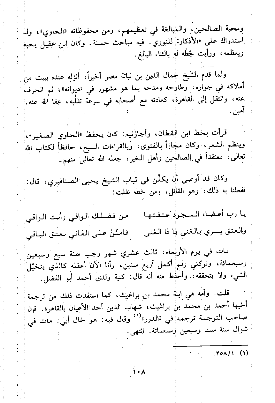 ومحبة الصالحين، والمبالغة في تعظيمهم، ومن محفوظاته "الحاوي"، وله استدراك على "الأذكار" للنووي. فيه مباحث حسنة. وكان ابن عقيل يحبه ويعظمه، ورأيت خطّه له بالثناء البالغ.