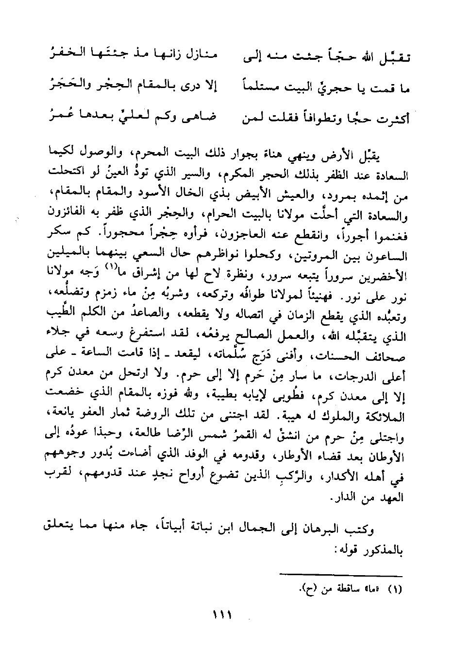 يقبِّل الأرض وينهي هناء بجوار ذلك البيت المحرم، والوصول لكيما السعادة عند الظفر بذلك الحجر المكرم، والسير الذي تودُّ العينُ لو اكتحلت من إثمده بمرود، والعيش الأبيض بذي الخال الأسود والمقام بالمقام، والسعادة التي أحلَّت مولانا بالبيت الحرام، والحِجْر الذي ظفر به الفائزون فغنموا أجورًا، وانقطع عنه العاجزون، فرأوه حِجْرًا محجورًا. كم سكر الساعون بين المروتين، وكحلوا نواظرهم حال السعي بينهما بالميلين الأخضرين سرورًا يتبعه سرور، ونظرة لاح لها من إشراق ما (¬1) وَجه مولانا نور على نور. فهنيئًا لمولانا طوافُه وتركعه، وشربُه مِنْ ماء زمزم وتضلُّعه، وتعبُّده الذي يقطع الزمان في اتصاله ولا يقطعه، والصاعدُ من الكلم الطَّيب الذي يتقبَّله اللَّه، والعمل الصالح يرفعُه، لقد استفرغ وسعه في جلاء صحائف الحسنات، وأفنى دَرَج سُلَّماته، ليقعد -إذا قامت الساعة- على أعلى الدرجات، ما سار مِنْ حَرم إلا إلى حرم. ولا ارتحل من معدن كرم إلا إلى معدن كرم، فطُوبى لإيابه بطيبة، وللَّه فوزه بالمقام الذي خضعت الملائكة والملوك له هيبة. لقد اجتنى من تلك الروضة ثمار العفو يانعة، واجتلى مِنْ حرم من انشقَّ له القمرُ شمس الرِّضا طالعة، وحبذا عودُه إلى الأوطان بعد قضاء الأوطار، وقدومه في الوفد الذي أضاعت بُدور وجوههم في أهله الأكدار، والرَّكبِ الذين تضوع أرواح نجدٍ عند قدومهم، لقرب العهد من الدار.