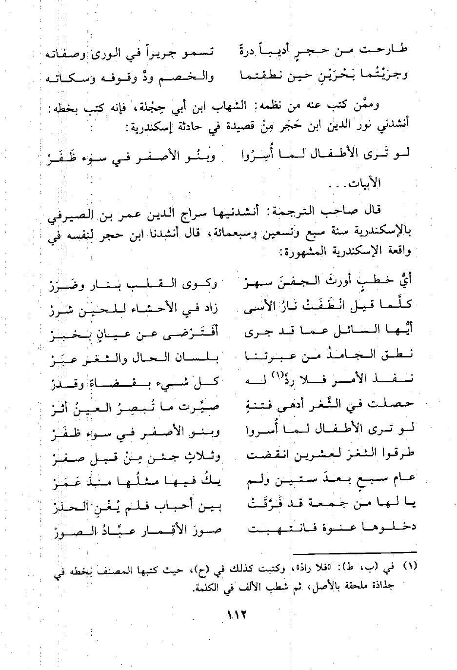 قال صاحب الترجمة: أنشدنيها سراج الدين عمر بن الصيرفي بالإسكندرية سنة سبع وتسعين وسبعمائة، قال أنشدنا ابن حجر لنفسه في واقعة الإسكندرية المشهورة: