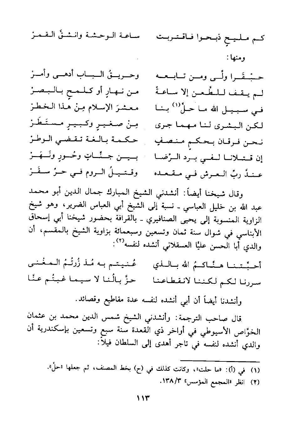 وقال شيخنا أيضًا: أنشدني الشيخ المبارك جمال الدين أبو محمد عبد اللَّه بن خليل العباسي -نسبة إلى الشيخ أبي العباس الضرير، وهو شيخ الزاوية المنسوبة إلى يحيى الصنافيري- بالقرافة بحضور شيخنا أبي إسحاق الأبناسي في شوال سنة ثمان وتسعين وسبعمائة بزاوية الشيخ بالمقسم، أن والدي أبا الحسن عليًّا العسقلاني أنشده لنفسه (¬2):