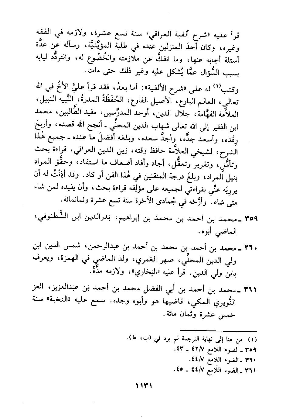 361 - محمد بن أحمد بن أبي الفضل محمد بن أحمد بن عبد العزيز، العز النُّويري المكي، قاضيها هو وأبوه وجده. سمع عليه "النخبة" سنة خمس عشرة وثمان مائة.