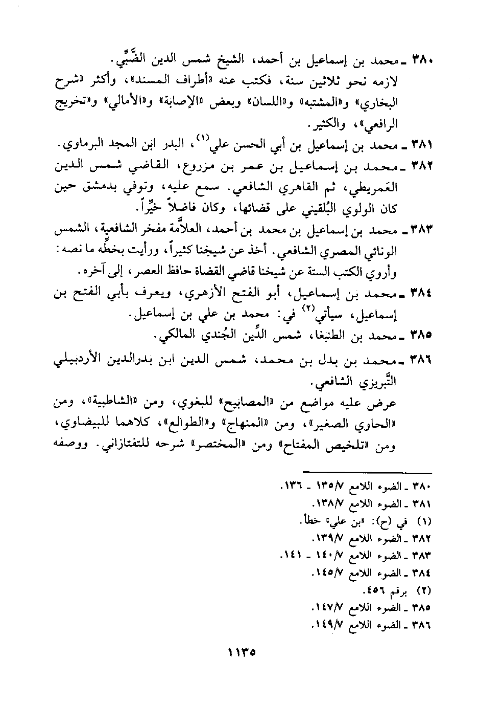383 - محمد بن إسماعيل بن محمد بن أحمد، العلَّامة مفخر الشافعية، الشمس الونائي المصري الشَّافعي. أخذ عن شيخِنا كثيرًا، ورأيت بخطِّه ما نصه: وأروي الكتب الستة عن شيخنا قاضي القضاة حافظ العصر، إلى آخره.