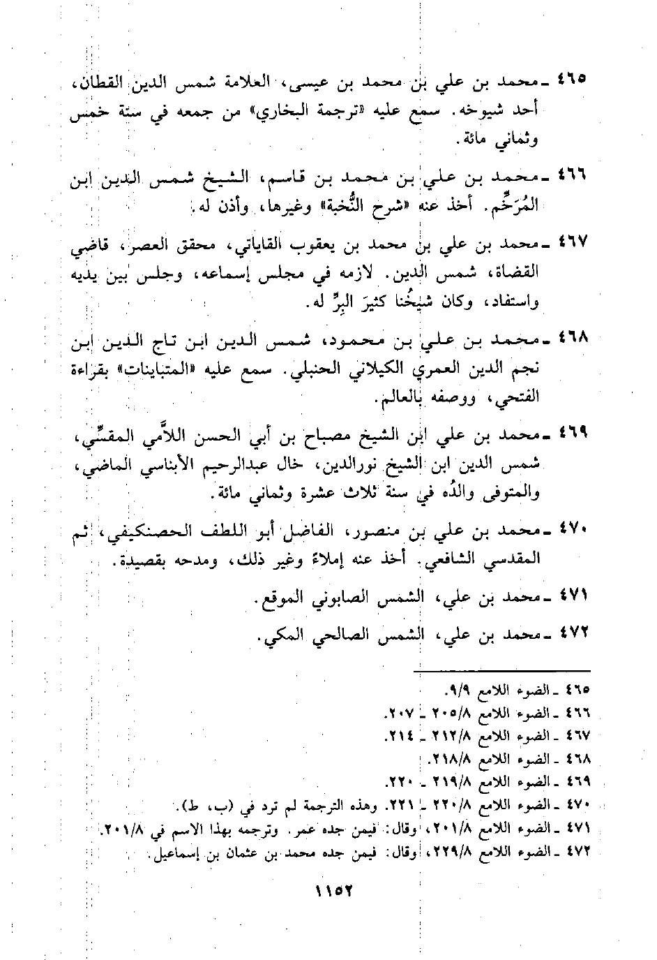 465 - محمد بن علي بن محمد بن عيسى، العلامة شمس الدين القطان، أحد شيوخه. سمع عليه "ترجمة البخاري" مِنْ جمعه في سنة خمس وثماني مائة.