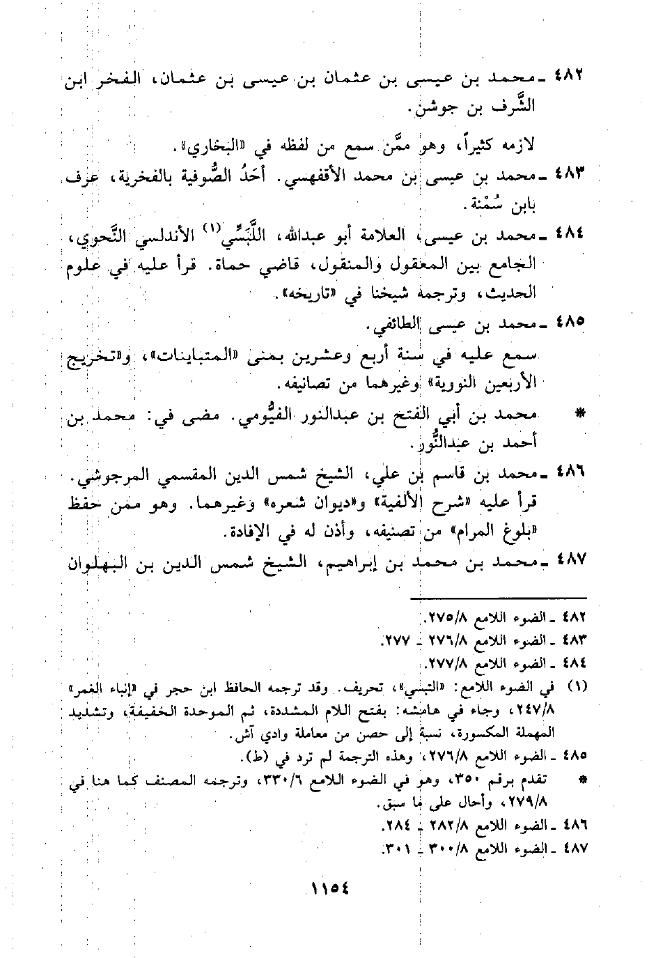 484 - محمد بن عيسى، العلامة أبو عبد اللَّه، اللَّبَسِّي (¬1) الأندلسي النَّحوي، الجامع بين المعقول والمنقول، قاضي حماة. قرأ عليه في علوم الحديث، وترجمه شيخنا في "تاريخه".