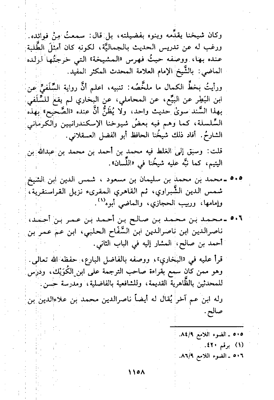 ورأيتُ بخطِّ الكمال ما ملخَّصُه: تنبيه، أعلم أنَّ رواية السِّلَفيِّ عن ابن البَطِر عن البيِّع، عن المحاملي، عن البخاري لم يقع للسِّلَفي بهذا السَّند سوى حديث واحد، ولا يُظَنُّ أنَّ عنده "االصَّحيح" بهذه السِّلسلة، كما وهم فيه بعضُ شيوخنا الإسكندرانيين والكرماني الشارحُ. أفاد ذلك شيخُنا الحافظ أبو الفضل العسقلاني.