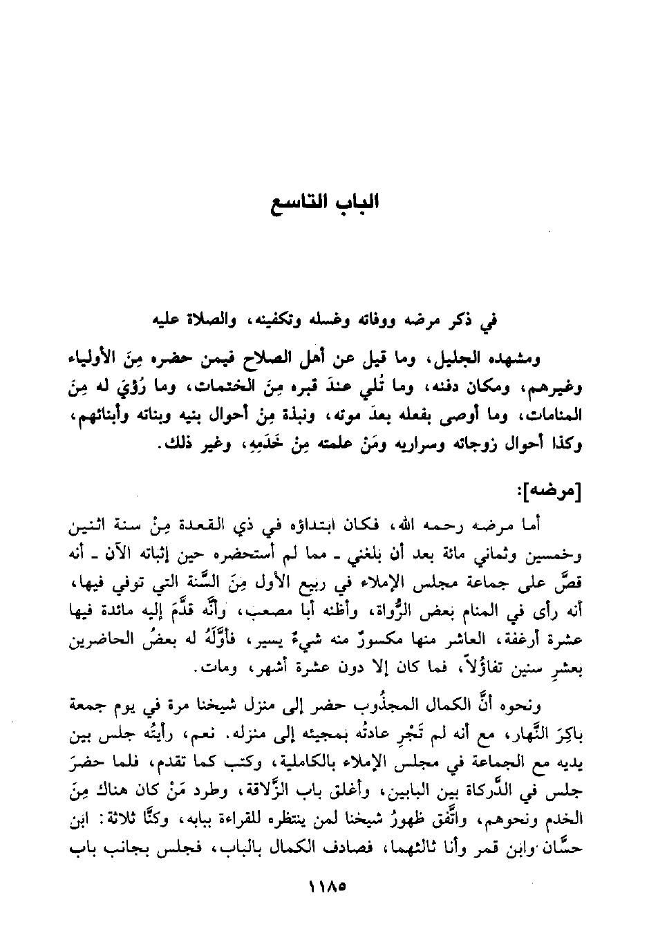 في ذكر مرضه ووفاته وغسله وتكفينه، والصلاة عليه ومشهده الجليل، وما قيل عن أهل الصلاح فيمن حضره مِنَ الأولياء وغيرهم، ومكان دفنه، وما تُلي عندَ قبره مِنَ الختمات، وما رُؤيَ له مِنَ المنامات، وما أوصى بفعله بعدَ موته، ونبذة مِنْ أحوال بنيه وبناته وأبنائهم، وكذا أحوال زوجاته وسراريه ومَنْ علمته مِنْ خَدَمِهِ، وغير ذلك.