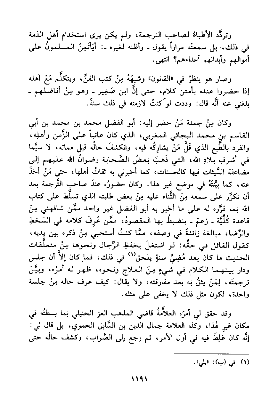 وكان مِنْ جملة مَنْ حضر إليه: أبو الفضل محمد بن محمد بن أبي القاسم بن محمد البجائي المغربي، الذي كان عاتبًا على الزَّمن وأهلِه، وانفرد بالطبع الذي قَلَّ مَنْ يشارِكُه فيه، وانكشفَ حالُه قبل مماته، لا سيَّما في أشرفِ بلادِ اللَّه، التي ذهب بعضُ الصحابة رضوانُ اللَّه عليهم إلى مضاعفة السَّيئات فيها كالحسنات، كما أخبرني به ثقاتُ أهلها، حتى مَنْ أخذَ عنه، كما بيَّنتُهُ في موضع غير هذا. وكان حضورُه عندَ صاحبُ التَّرجمة بعد أن تكرَّر على سمعه مِنَ الثَّناء عليه مِنْ بعض طلبته الذي تسلَّط على كتاب اللَّه بما قرَّره له على ما أخبر به أبو الفضل غير واحد ممَّن شافهني مِنْ قاعدة كُلِّيَّة -زعمَ- ينضبطُ بها المقصودُ، ممَّن عُرِفَ كلامه في السّخطِ والرِّضا، مبالغة زائدةً في وصفه، ممَّا كنتُ أستحيي مِنْ ذكره بين يديه، كقول القائل في حقِّه: لو اشتغلَ بحفظِ الرِّجال ونحوها مِنْ متعلِّقات الحديث ما كان بعد مُضِيِّ سنةٍ يلحق (¬1) في ذلك، فما كان إلَّا أن جلس ودار بينهما الكلام في شيءٍ مِنَ العلاج ونحوه، ظهر له أمرُه، وبيَّنَ ترجمتَه، لِمَنْ يثقُ به بعد مفارقته، ولا يقال: كيف عرف حاله مِنْ جلسة واحدة، لكون مثل ذلك لا يخفى على مثله.