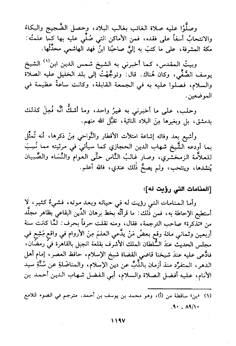 وصلَّوا عليه صلاة الغائب بغالب البلاد، وحصل الضَّجيج والبكاءُ والانتحابُ أسفًا على فقده، فمن الأماكن التي صُلِّي عليه بها كما علمتُه: مكة المشرفة، على ما كتبَ به إليَّ صاحبُنا ابنُ فهد الهاشمي محدِّثُها.