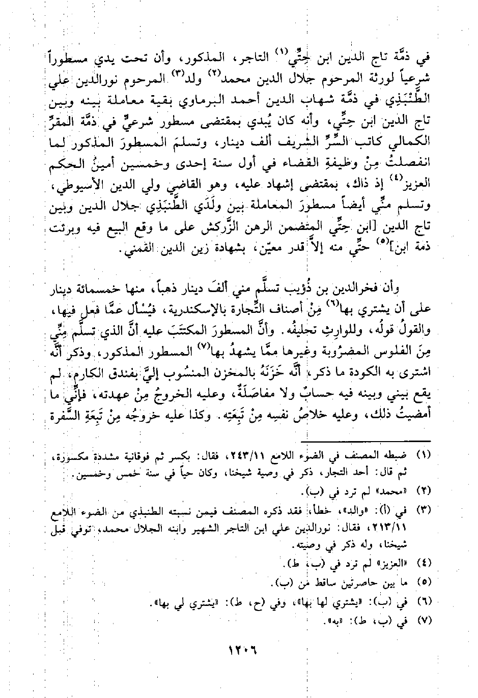 في ذمَّة تبع الدين ابن حِتِّي (¬1) التاجر، المذكور، وأن تحت يدي مسطورًا شرعيًا لورثة المرحوم جلال الدين محمد (¬2) ولد (¬3) المرحوم نور الدين علي الطَّنْبَذِي في ذمَّة شهاب الدين أحمد البرماوي بقية معاملة بينه وبين تاج الدين ابن حِتِّي، وأنه كان يُبدي بمقتضى مسطور شرعيٍّ في ذمَّة المقرِّ الكمالي كاتب السِّرِّ الشريف ألف دينار، ونسلمَ المسطورَ المذكور لما انفصلتُ من وظيفةِ القضاء في أول سنة إحدى وخمسين أمينُ الحكم العزيز (¬4) إذ ذاك، بمقتضى إشهاد عليه، وهو القاضي ولي الدين الأسيوطي، وتسلم منِّي أيضًا مسطورَ المعاملة بين ولَدَي الطَّنبَذِي جلال الدين وبين تاج الدين [ابن حِتِّي المتضمن الرهن الزَّركش على ما وقع البيع فيه وبرئت ذمة ابن] (¬5) حتِّي منه إلّا قدر معيّن، بشهادة زين الدين القمني.