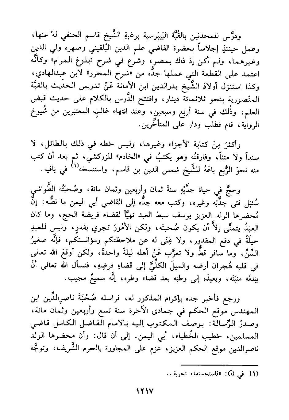 ورجع فأخبر جده بإكرام المذكور له، فراسله صُحْبَةَ ناصرِ الدِّين ابن المهندس موقع الحكم في جمادى الآخرة سنة تسع وأربعين وثمان مائة، وصدرُ الرِّسالة: بوصف المكتوب إليه بالإمام الفاضل الكامل قاضي المسلمين، خطيب الخُطباء: أبي اليمن. إلى أن قال: وأن محضرها الولد ناصر الدين موقع الحكم العزيز، عزم على المجاورة بالحرم الشَّريف، وتوجَّه