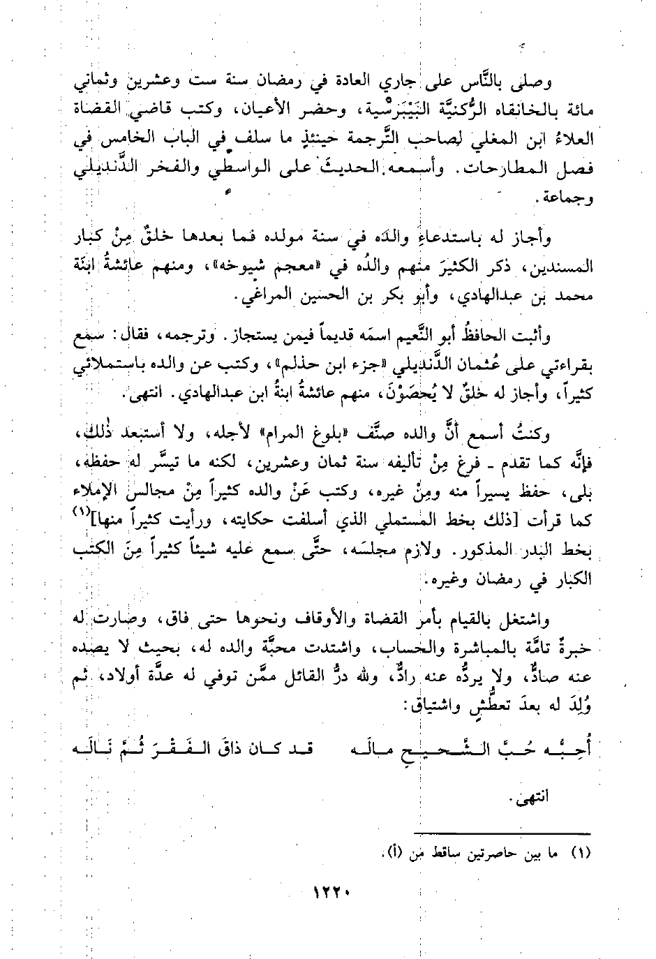 وكنتُ أسمع أنَّ والده صنَّف "بلوغ المرام" لأجله، ولا أستبعد لملك، فإنَّه كما تقدم- فرغ مِنْ تأليفه سنة ثمان وعشرين، لكنه ما تيسَّر له حفظه، بلى، حفظ يسيرًا منه ومِنْ غيره، وكتب عَنْ والده كثيرًا مِنْ مجالس الإملاء كما قرأت [ذلك بخط المستملي الذي أسلفت حكايته، ورأيت كثيرًا منها] (¬1) بخط البدر المذكور. ولازم مجلسَه، حتَّى سمع عليه شيئًا كثيرًا مِنَ الكتب الكبار في رمضان وغيره.