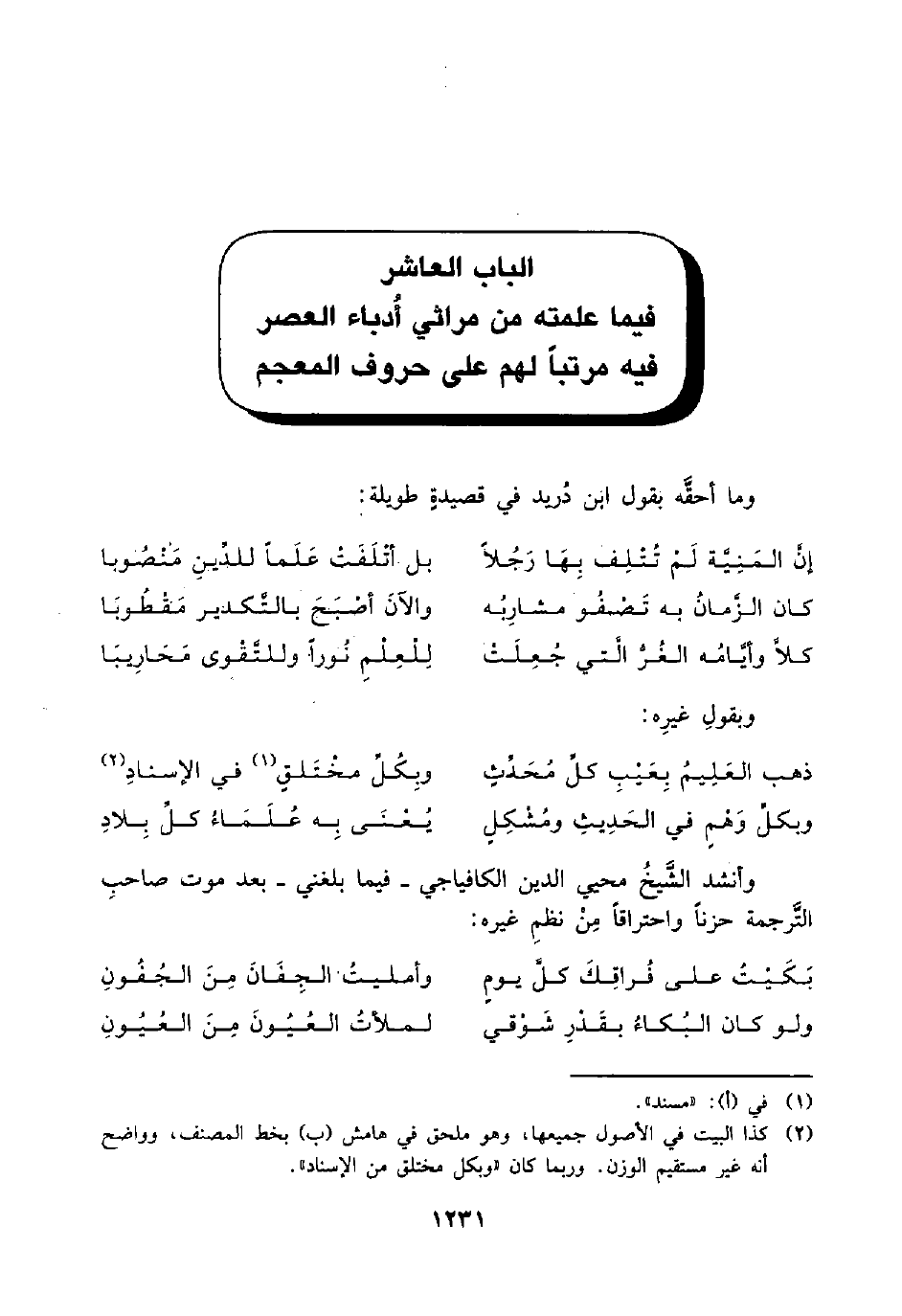 إنَّ المَنِيَّة لَم تُتْلِف بِهَا رَجُلًا ... بل أتْلَفَت عَلَمًا للدِّين مَنْصُوبا