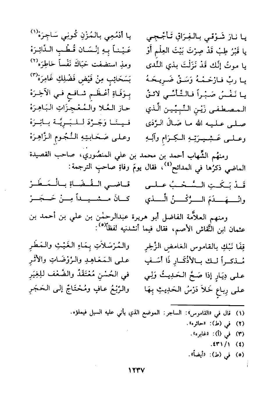 يا نارَ شَوْقي بالفِرَاقِ تأجَّجِي ... يا أدْمُعِي بالمُزْنِ كُوني سَاجِرهْ (¬1)
