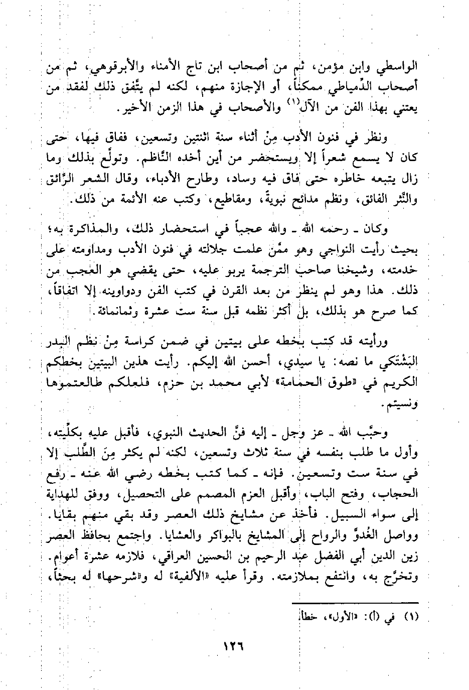 ورأيته قد كتب بخطه على بيتين في ضمن كراسة مِنْ نظم البدر البَشْتَكي ما نصه: يا سيدي، أحسن اللَّه إليكم. رأيت هذين البيتين بخطكم الكريم في "طوق الحمامة" لأبي محمد بن حزم، فلعلكم طالعتموها ونسيتم.