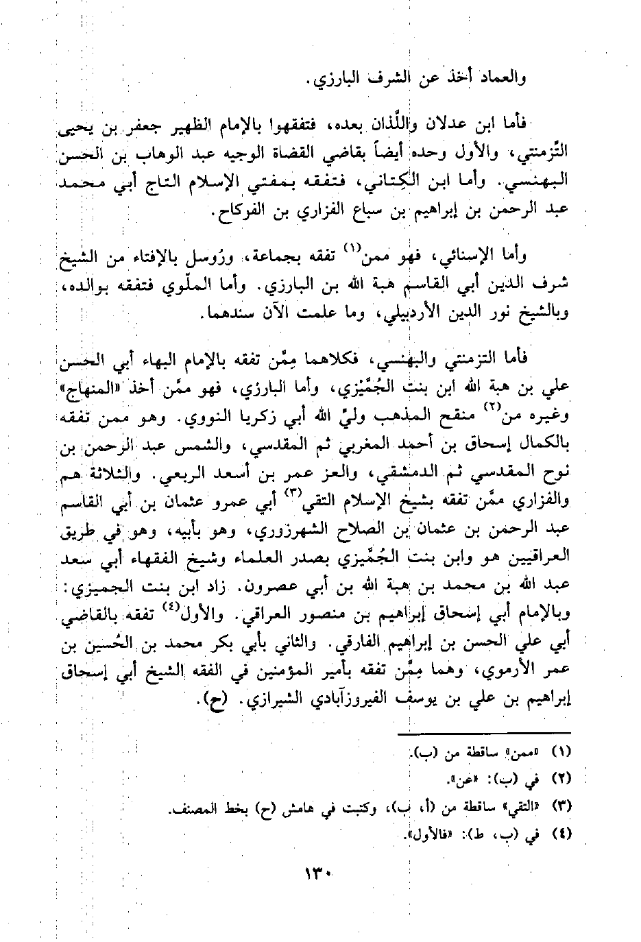 فأما التزمنتي والبهنسي، فكلاهما مِمَّن تفقه بالإمام البهاء أبي الحسن علي بن هبة اللَّه ابن بنت الجُمَّيْزي، وأما البارزي، فهو ممّن أخذ "المنهاج" وغيره من (¬2) منقح المذهب وليِّ اللَّه أبي زكريا النووي. وهو ممن تفقه بالكمال إسحاق بن أحمد المغربي ثم المقدسي، والشمس عبد الرحمن بن نوح المقدسي ثم الدمشقي، والعز عمر بن أسعد الربعي. والثلاثة هم والفزاري ممَّن تفقه بشيخ الإسلام التقي (¬3) أبي عمرو عثمان بن أبي القاسم عبد الرحمن بن عثمان بن الصلاح الشهرزوري، وهو بأبيه، وهو في طريق العراقيين هو وابن بنت الجُمَّيزي بصدر العلماء وشيخ الفقهاء أبي سعد عبد اللَّه بن محمد بن هبة اللَّه بن أبي عصرون. زاد ابن بنت الجميزي: وبالإمام أبي إسحاق إبراهيم بن منصور العراقي. والأول (¬4) تفقه بالقاضي أبي علي الحسن بن إبراهيم الفارقي. والثاني بأبي بكر محمد بن الحُسين بن عمر الأرموي، وهما مِمَّن تفقه بأمير المؤمنين في الفقه الشيخ أبي إسحاق إبراهيم بن علي بن يوسف الفيروزآبادي الشيرازي. (ح).