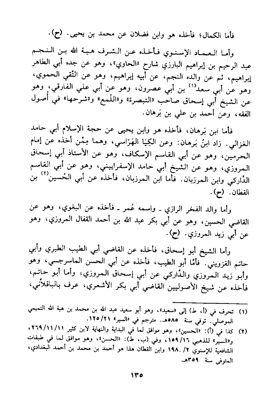 فأما ابن بَرهان، فأخذه هو وابن يحيى عن حجة الإسلام أبي حامد الغزالي. زاد ابنُ بَرهان: وعن الكِيَا الهَرّاسي، وهما مِمَّن أخذه عن إمام الحرمين، وهو عن أبي القاسم الإسكاف، وهو عن الأستاذ أبي إسحاق المروزي، وهو عن الشيخ أبي حامد الإسفراييني، وهو عن أبي القاسم الدَّاركي وابن المرزبان. فأما ابن المرزبان، فأخذه عن أبي الحُسين (¬2) بن القطان. (ح).
