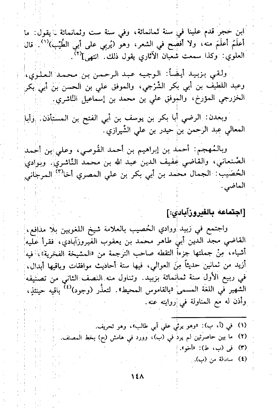 واجتمع في زبيد ووادي الحُصيب بالعلامة شيخ اللغويين بلا مدافع، القاضي مجد الدين أبي طاهر محمد بن يعقوب الفيروزآبادي، فقرأ عليه أشياء، مِنْ جملتها جزءًا التقطه صاحب الترجمة من "المشيخة الفخرية"، فيه أزيد من ثمانين حديثًا مِنَ العوالي، فيها ستة أحاديث موافقات وباقيها أبدال، في ربيع الأول سنة ثمانمائة بزبيد. وتناول منه النصف الثاني من تصنيفه الشهير في اللغة المسمى "بالقاموس المحيط". لتعذُّر (وجود) (¬4) باقيه حينئذٍ، وأذن له مع المناولة في روايته عنه.