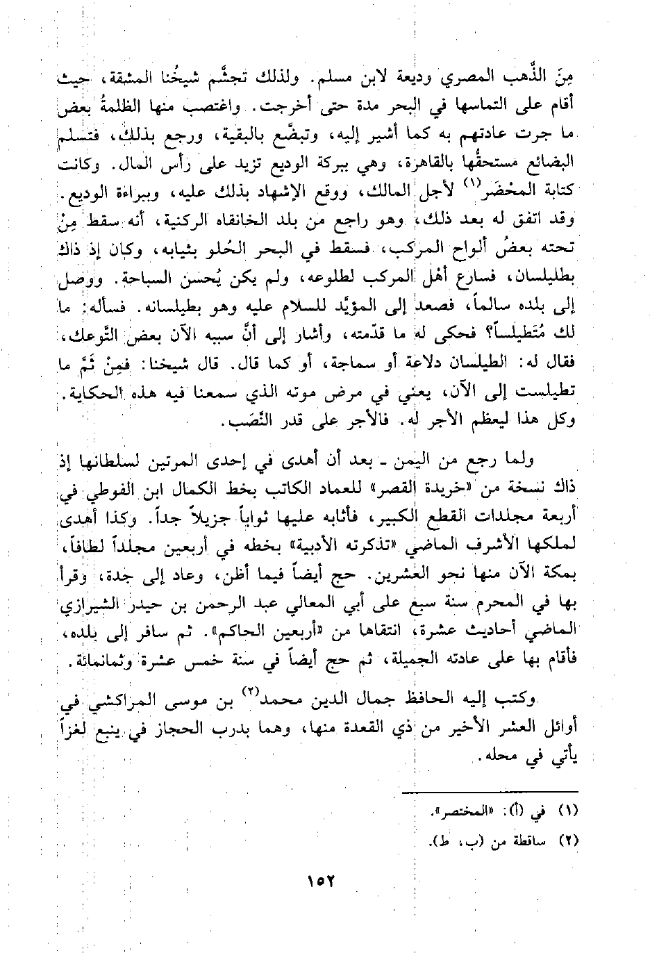 مِنَ الذَّهب المصري وديعة لابن مسلم. ولذلك تجشَّم شيخُنا المشقة، حيث أقام على التماسها في البحر مدة حتى أخرجت. واغتصب منها الظلمةُ بعض ما جرت عادتهم به كما أشير إليه، وتبضَّع بالبقية، ورجع بذلك، فتسلم البضائه مستحقُّها بالقاهرة، وهي ببركة الوديع تزيد على رأس المال. وكانت كتابة المحْضَر (¬1) لأجل المالك، ووقع الإشهاد بذلك عليه، وببراءة الوديع. وقد اتفق له بعد ذلك، وهو راجع من بلد الخانقاه الركنية، أنه سقط مِنْ تحته بعضُ ألواح المركب، فسقط في البحر الحُلو بثيابه، وكان إذ ذاك بطليلسان، فسارع أهْل المركب لطلوعه، ولم يكن يُحسن السباحة. ووصل إلى بلده سالمًا، فصعد إلى المؤيَّد للسلام عليه وهو بطيلسانه. فسأله: ما لك مُتَطيلسًا؟ فحكى له ما قدَّمته، وأشار إلى أن سببه الآن بعض التَّوعك، فقال له: الطيلسان دلاعة أو سماجة، أو كما قال. قال شيخنا: فمِنْ ثَمَّ ما تطيلست إلى الآن، يعني في مرض موته الذي سمعنا فيه هذه الحكاية. وكل هذا ليعظم الأجر له. فالأجر على قدر النَّصَب.