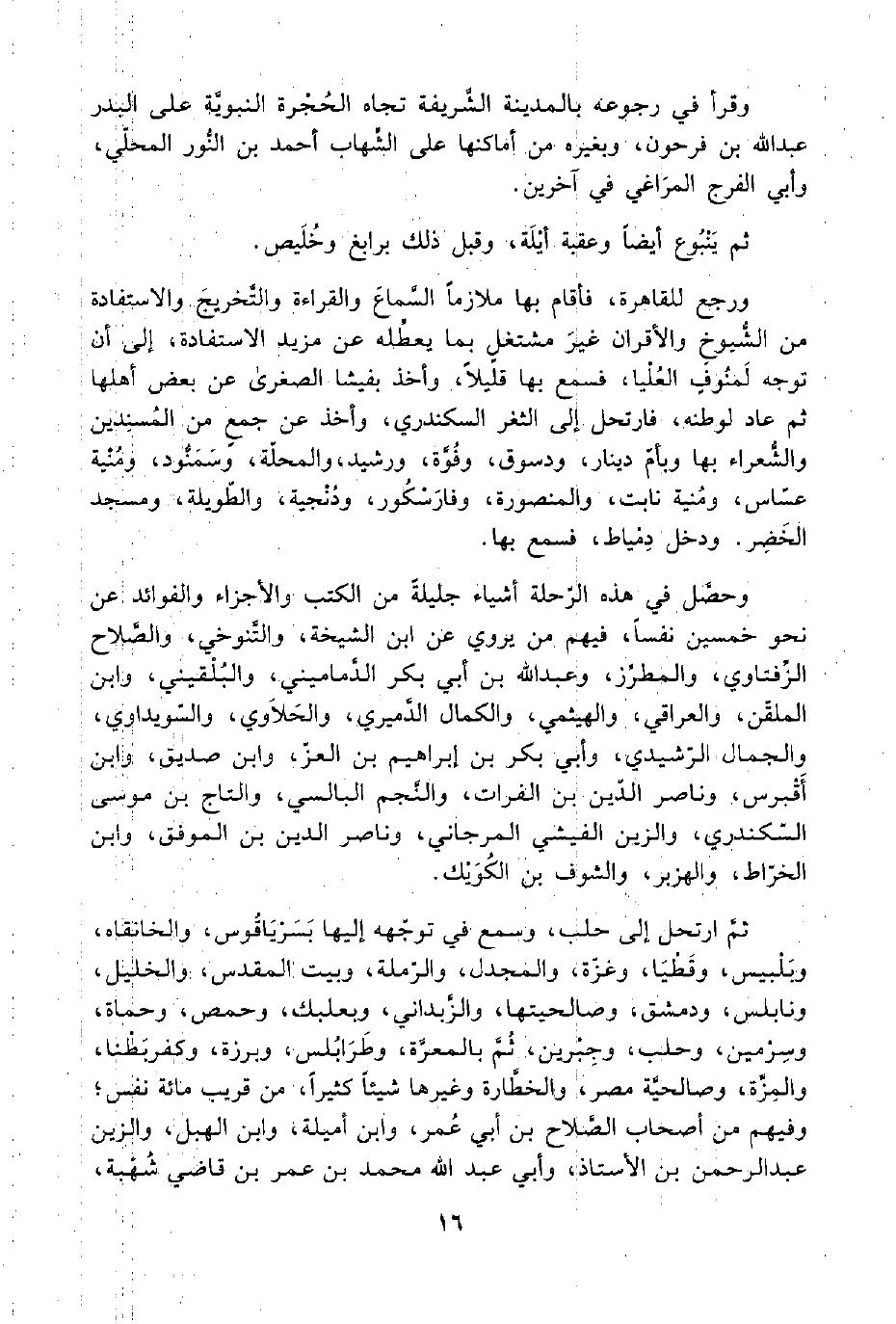 ثم ارتحل إلى حلب، وسمع في توجّهه إليها بَسَرْيَاقُوس، والخانقاه، وبَلْبيس، وقَطْيَا، وغزّة، والمجدل، والرّملة، وبيت المقدس، والخليل، ونابلس، ودمشق، وصالحيتهيا، والزَّبداني، وبعلبك، وحمص، وحماة، وسِرْمين، وحلب، وجِبْرين، ثُمَّ بالمعرَّة، وطَرَابُلس، وبرزة، وكفربَطْنا، والمِزَّة، وصالحيَّة مصر، والخطَّارة وغيرها شيئًا كثيرًا، من قريب مائة نفس؛ وفيهم من أصحاب الصَّلاح بن أبي عُمر، وابن أميلة، وابن الهبل، والزين عبد الرحمن بن الأستاذ، وأبي عبد اللَّه محمد بن عمر بن قاضي شُهْبة،