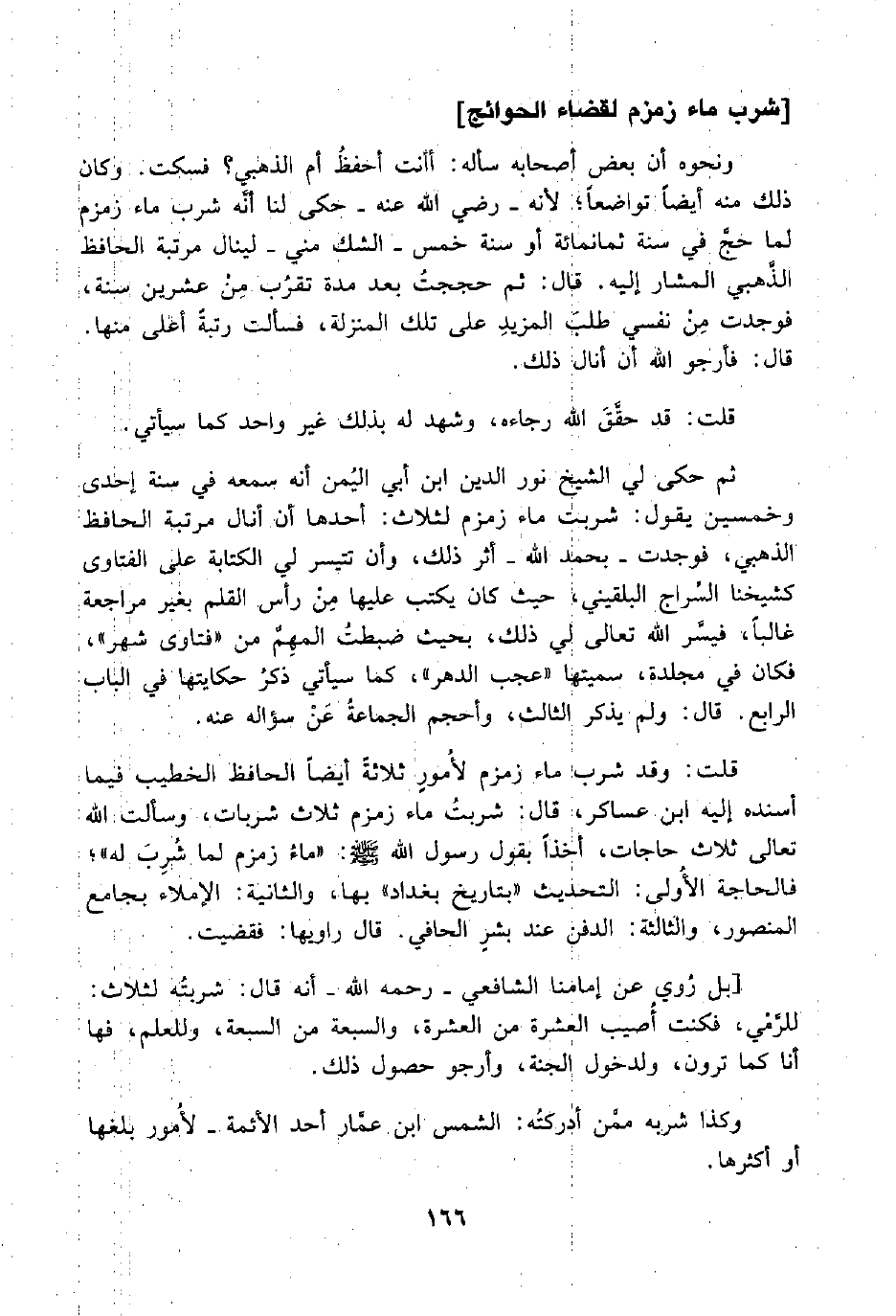 قلت: وقد شرب ماء زمزم لأمورٍ ثلاثةً أيضًا الحافظ الخطيب فيما أسنده إليه ابن عساكر، قال: شربتُ ماء زمزم ثلاث شربات، وسألت اللَّه تعالى ثلاث حاجات أخذًا بقول رسول اللَّه -صلى اللَّه عليه وسلم-: "ماءُ زمزم لما شُرِبَ له"؛ فالحاجة الأُولى: التحديث "بتاريخ بغداد" بها، والثانية: الإملاء بجامع المنصور، والثالثة: الدفن عند بشرٍ الحافي. قال راويها: فقضيت.