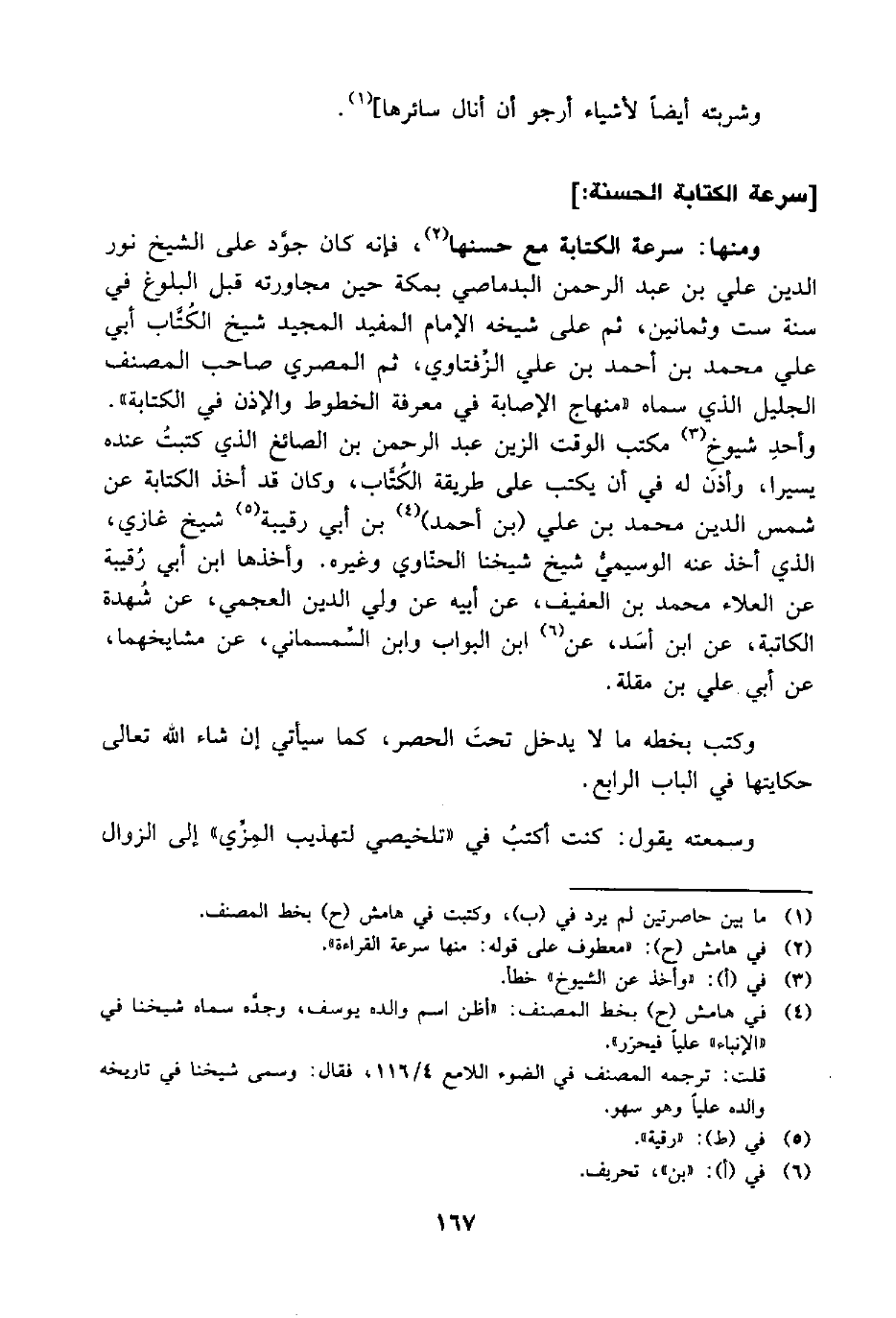ومنها: سرعة الكتابة مع حسنها (¬2)، فإنه كان جوَّد على الشيخ نور الدين علي بن عبد الرحمن البدماصي بمكة حين مجاورته قبل البلوغ في سنة ست وثمانين، ثم على شيخه الإمام المفيد المجيد شيخ الكُتَّاب أبي علي محمد بن أحمد بن علي الزِّفتاوي، ثم المصري صاحب المصنف الجليل الذي سماه "منهاج الإصابة في معرفة الخطوط والإذن في الكتابة". وأحدِ شيوخ (¬3) مكتب الوقت الزين عبد الرحمن بن الصائغ الذي كتبت عنده يسيرا، وأذنَ له في أن يكتب على طريقة الكُتَّاب، وكان قد أخذ الكتابة عن شمس الدين محمد بن علي (بن أحمد) (¬4) بن أبي رقيبة (¬5) شيخ غازي، الذي أخذ عه الوسيميُّ شيخ شيخنا الحنّاوي وغيره. وأخذها ابن أبي رُقيبة عن العلاء محمد بن العفيف، عن أبيه عن ولي الدين العجمي، عن شُهدة الكاتبة، عن ابن أسَد، عن (¬6) ابن البواب وابن السِّمسماني، عن مشايخهما، عن أبي علي بن مقلة.