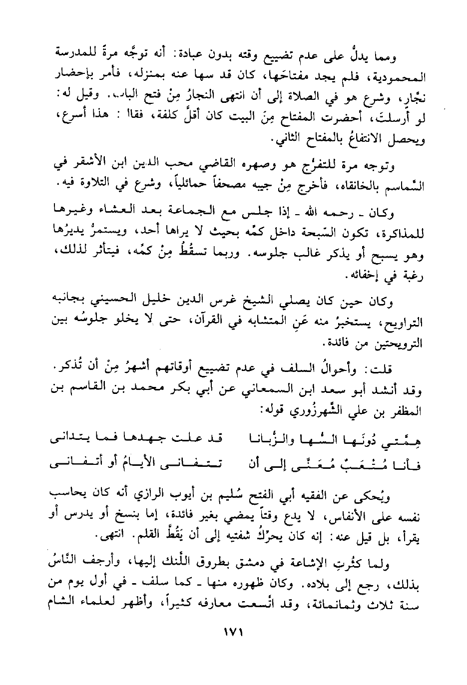 قلت: وأحوالُ السلف في عدم تضييع أوقاتهم أشهرُ مِنْ أن تُذكر. وقد أنشد أبو سعد ابن السمعاني عن أبي بكر محمد بن القاسم بن المظفر بن علي الشَّهرزُوري قوله: