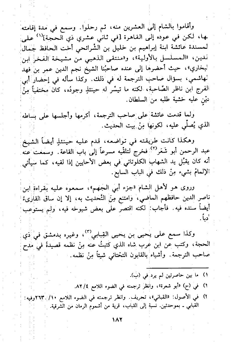 وأقاموا بالشام إلى العشرين منه، ثم رحلوا. وسمع في مدة إقامته بها، لكن في عوده إلى القاهرة [في ثاني عشري ذي الحجة] (¬1) على المسندة عائشة ابنة إبراهيم بن خليل بن الشَّرائحي أخت الحافظ جمال الدين، "المسلسل بالأولية"، و"منتقى الذهبي من مشيخة الفخر ابن البخاري"، حيث أحضرها إلى عنده صاحبُنا الشيخ نجم الدين عمر بن فهد الهاشمي، بسؤال صاحب الترجمة له في ذلك. وكذا سأله في إحضار أبي الفرج ابن ناظر الصَّاحبة، لكنه ما تيسَّر له حينئذٍ وجودُه، كان مختفيًا مِنْ ديْنٍ عليه خشية طلبه من السلطان.