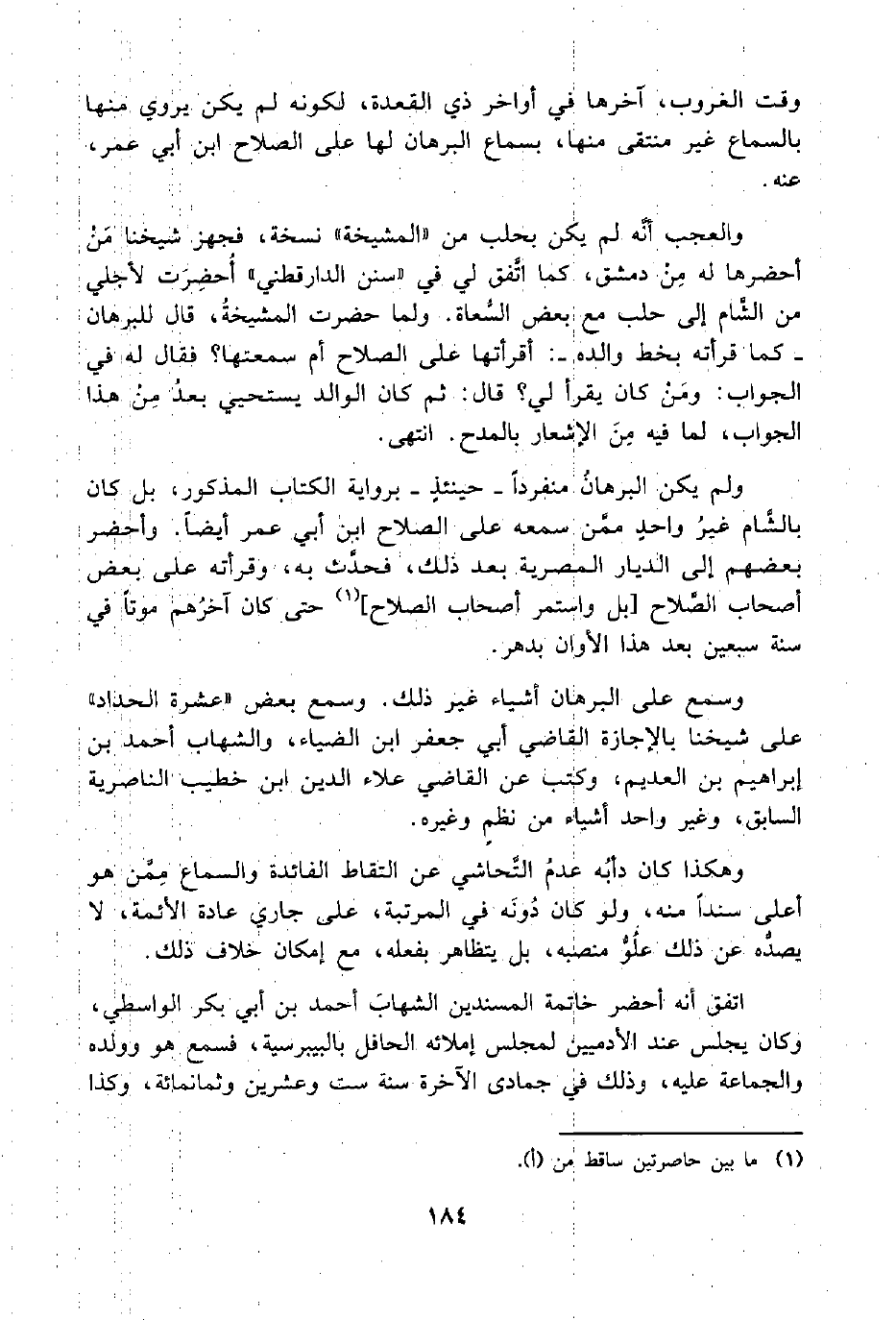 والعجب أنَّه لم يكن بحلب من "المشيخة" نسخة، فجهز شيخنا مَنْ أحضرها له مِنْ دمشق، كما اتفق لي في "سنن الدارقطني" أُحضِرَت لأجلي من الشَّام إلى حلب مع بعض السُّعاة. ولما حضرت المشيخةُ، قال للبرهان -كما قرأته بخط والده-: أقرأتها على الصلاح أم سمعتها؟ فقال له في الجواب: ومَنْ كان يقرأ لي؟ قال: ثم كان الوالد يستحيي بعدُ مِنْ هذا الجواب، لما فيه مِنَ الإشعار بالمدح. انتهى.