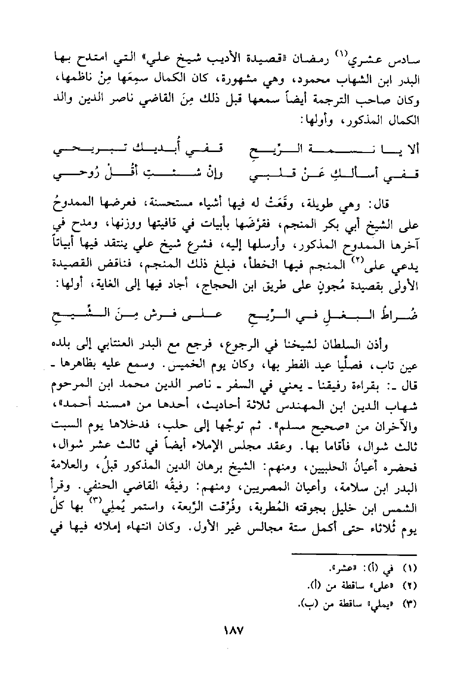 سادس عشري (¬1) رمضان "قصيدة الأديب شيخ علي" التي امتدح بها البدر ابن الشهاب محمود، وهي مشهورة، كان الكمال سمِعَها مِنْ ناظمها، وكان صاحب الترجمة أيضًا سمعها قبل ذلك مِنَ القاضي ناصر الدين والد الكمال المذكور، وأولها: