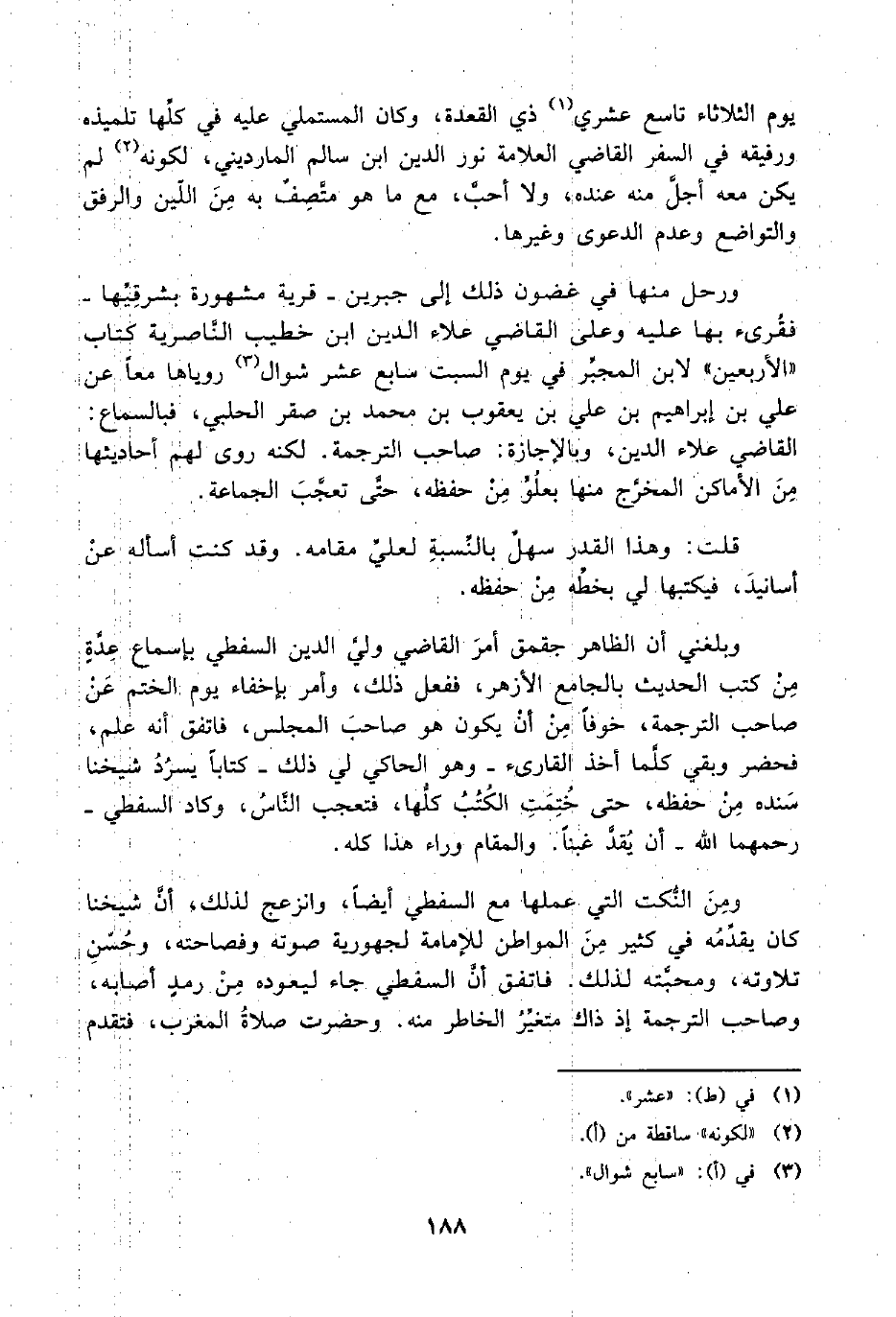 ورحل منها في غضون ذلك إلى جبرين -قرية مشهورة بشرقِيِّها- فقُرىء بها عليه وعلى القاضي علاء الدين ابن خطيب النَّاصرية كتاب "الأربعين" لابن المجبِّر في يوم السبت سبع عشر شوال (¬3) روياها معًا عن علي بن إبراهيم بن علي بن يعقوب بن محمد بن صقر الحلبي، فبالسمع: القاضي علاء الدين، وبالإجازة: صاحب الترجمة. لكنه روى لهم أحاديثها مِنَ الأماكن المخرَّج منها بعلُوّ مِنْ حفظه، حتى تعجَّبَ الجماعة.