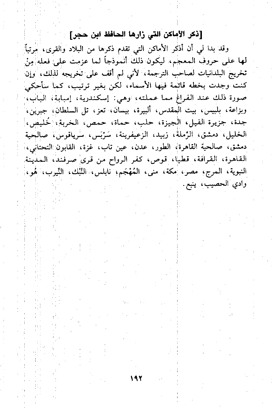وقد بدا لي أن أذكر الأماكن التي تقدم ذكرها من البلاد والقرى، مرتبًا لها على حروف المعجم، ليكون ذلك أنموذجًا لما عزمت على فعله مِنْ تخريج البلدانيات لصاحب الترجمة، لأني لم أقف على تخريجه لذلك، وإن كنت وجدت بخطه قائمة فيها الأسماء، لكن بغير ترتيب، كما سأحكي صورة ذلك عند الفراغ مما عملته، وهي: إسكندرية، إمبابة، الباب، وبزاعة، بلبيس، بيت المقدس، ألبيرة، بيسان، تعز، تل السلطان، جبرين، جدة، جزيرة الفيل، الجيزة، حلب، حماة، حمص، الخربة، خُليص، الخليل، دمشق، الرَّملة، زبيد، الزعيفرينة، سَرْبَس، سرياقوس، صالحية دمشق، صالحية القاهرة، الطور، عدن، عين تاب، غزة، القابون التحتاني، القاهرة، القرافة، قطيا، قوص، كفر الرواح من قرى صرفند، المدينة النبوية، المرج، مصر، مكة، منى، المُهْجَم، نابلس، النَّبْك، النَّيرب، هُو، وادي الحصيب، ينبع.