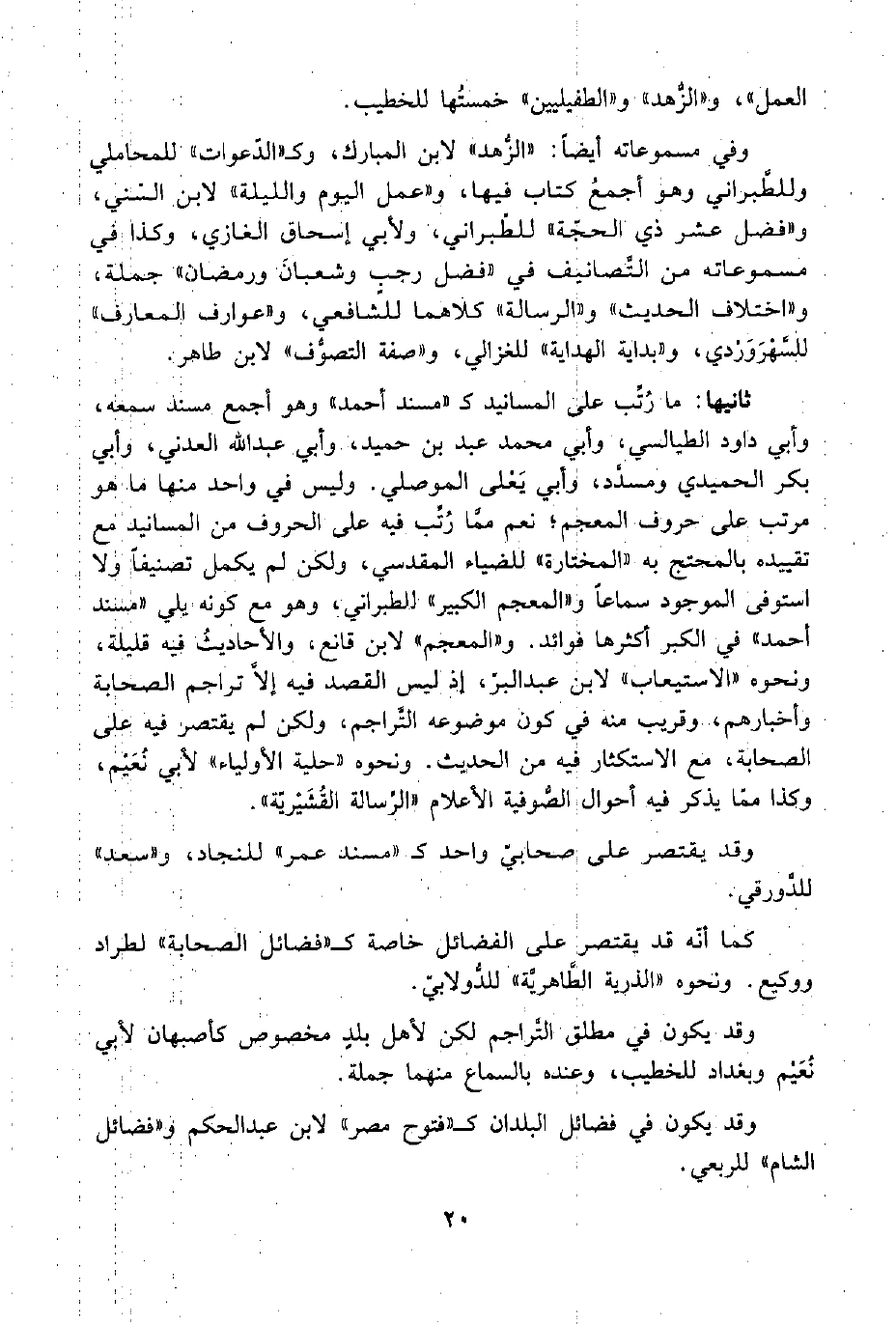 ثانيها: ما رُتِّب على المسانيد كـ "مسند أحمد" وهو أجمع مسند سمعه، وأبي داود الطيالسي، وأبي محمد عبد بن حميد، وأبي عبد اللَّه العدني، وأبي بكر الحميدي ومسدَّد، وأبي يَعْلى الموصلي. وليس في واحد منها ما هو مرتبا على حروف المعجم؛ نعم ممَّا رُتِّب فيه على الحروف من المسانيد مع تقييده بالمحتج به "المختارة" للضياء المقدسي، ولكن لم يكمل تصنيفًا ولا استوفى الموجود سماعًا و"المعجم الكبير" الطبراني، وهو مع كونه يلي "مسند أحمد" في الكبر أكثرها فوائد. و"المعجم" لابن قانع، والأحاديثُ فيه قليلة، ونحوه "الاستيعاب" لابن عبد البرّ، إذ ليس القصد فيه إلَّا تراجم الصحابة وأخبارهم، وقريب منه في كون موضوعه التَّراجم، ولكن لم يقتصر فيه على الصحابة، مع الاستكثار فيه من الحديث. ونحوه "حلية الأولياء" لأبي نُعَيْم، وكذا ممَّا يذكر فيه أحوال الصُّوفية الأعلام "الرِّسالة القُشَيْريّة".