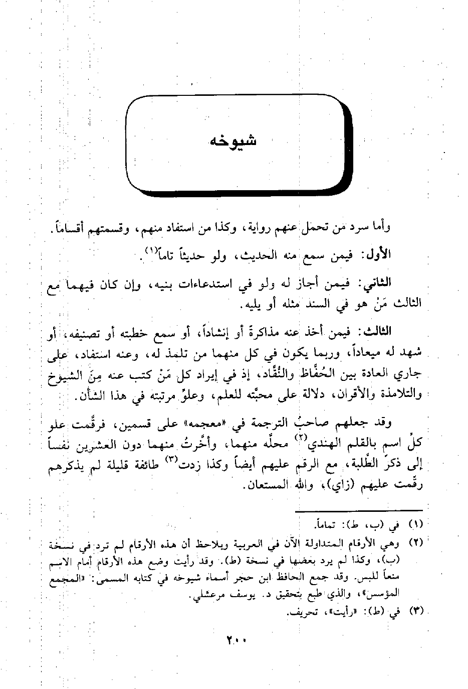 (¬2) وهي الأرقام المتداولة الآن في العربية ويلاحظ أن هذه الأرقام لم ترد في نسخة (ب)، وكذا لم يرد بعضها في نسخة (ط). وقد رأيت وضع هذه الأرقام أمام الاسم منعًا للبس. وقد جمع الحافظ ابن حجر أسماء شيوخه في كتابه المسمى: "المجمع المؤسس"، والذي طبع بتحقيق د. يوسف مرعشلي.