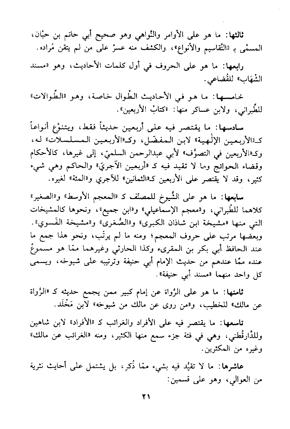 سادسها: ما يقتصر فيه على أربعين حديثًا فقط، ويتنوَّع أنواعًا كـ "الأربعين الإلهية" لابن المفضّل، وكـ "الأربعين المسلسلات" له، وكـ "الأربعين في التصوُّف" لأبي عبد الرحمن السلمي، إلى غيرها، كالأحكام وقضاء الحوائج وما لا تقيد فيه كـ "أربعين الآجريّ" والحاكم وهي شيء كثير، وقد لا يقتصر على الأربعين كـ "الثمانين" للآجري و"المئة" لغيره.