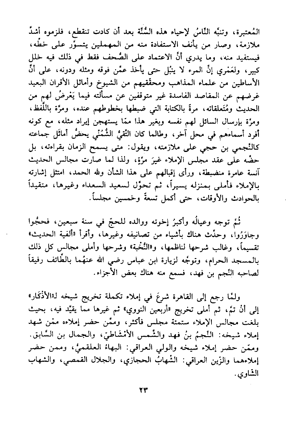 المُعتبرة، وتنبَّه النَّاسُ لإحياء هذه السُّنَّة بعد أن كادت تنقطع، فلزموه أشدَّ ملازمة، وصار من يأنف الاستفادة منه من المهملين يتسوَّر على خطِّه، فيستفيد منه، وما يدري أنَّ الاعتماد على الصُّحف فقط في ذلك فيه خلل كبير، ولعَمري إنَّ المرء لا ينبُل حتى يأخذ عمَّن فوقه ومثله ودونه، على أنَّ الأساطين من علماء المذاهب ومحقّقيهم من الشيوخ وأماثل الأقران البعيد غرضهم عن المقاصد الفاسدة غير متوقفين عن مسألته فيما يَعْرضُ لهم من الحديث ومُتَعلقاته، مرةً بالكتابة التي ضبطها بخطوطهم عنده، ومرَّة باللَّفظ، ومرَّة بإرسال السائل لهم نفسه وبغير هذا ممَّا يستهجن إيراد مثله، مع كونه أفرد أسماءهم في محل آخر، وطالما كان التَّقيُّ الشُّمُنِّي يحضُّ أماثَل جماعته كالنَّجمي بن حجي على ملازمته، ويقول: متى يسمح الزمان بقراءته، بل حضَّه على عقد مجلس الإملاء غيرَ مرَّةٍ، ولذا لما صارت مجالس الحديث آنسة عامرة منضبطة، ورأى إقبالهم على هذا الشأن وللَّه الحمد، امتثل إشارته بالإملاء فأملى بمنزله يسيرًا، ثم تحوَّل لسعيد السعداء وغيرها، متقيدًا بالحوادث والأوقات، حتى أكمل تسعةً وخمسين مجلسًا.
