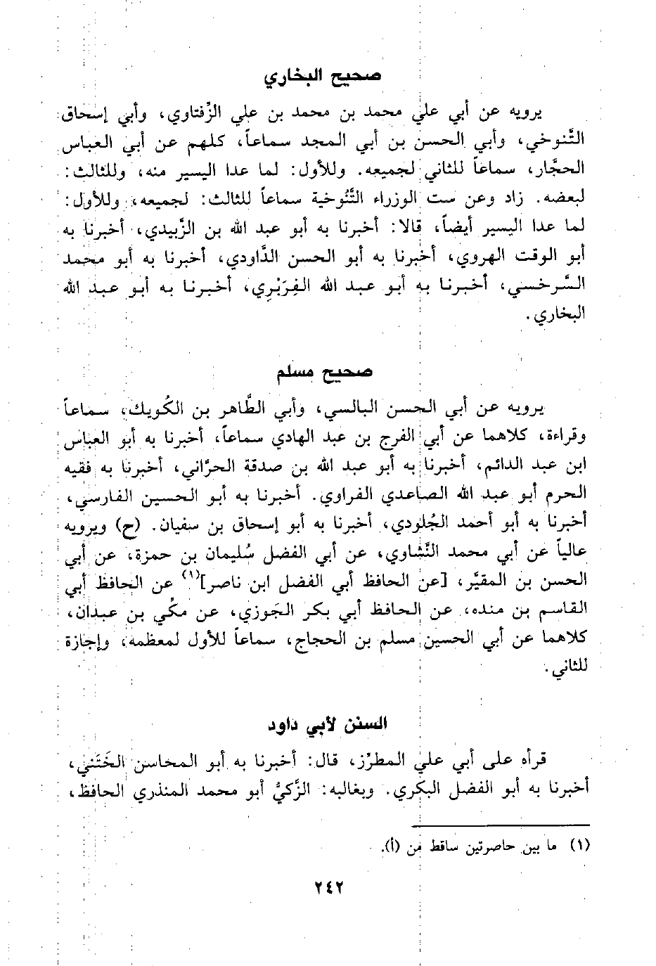 يرويه عن أبي علي محمد بن محمد بن عبي الزِّفتاوي، وأبي إسحاق التَّنوخي، وأبي الحسن بن أبي المجد سماعًا، كلهم عن أبي العباس الحجَّا، سماعًا للثاني لجميعه. وللأول: لما عدا اليسير منه، وللثالث: لبعضه. زاد وعن ست الوزراء التَّنُوخية سماعًا للثالث: لجميعه، وللأول: لما عدا اليسير أيضًا، قالا: أخبرنا به أبو عبد اللَّه بن الزَّبيدي، أخبرنا به أبو الوقت الهروي، أخبرنا به أبو الحسن الدَّاودي، أخبرنا به أبو محمد السَّرخسي، أخبرنا به أبو عبد اللَّه الفِرَبْرِي، أخبرنا به أبو عبد اللَّه البخاري.