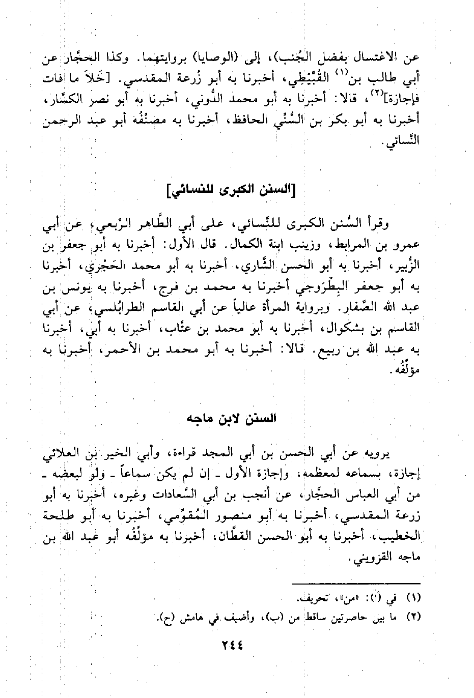 عن الاغتسال بفضل الجُنب)، إلى (الوصايا) بروايتهما. وكذا الحجَّار عن أبي طالب بن (¬1) القُبَّيْطِي، أخبرنا به أبو زُرعة المقدسي. [خَلَا ما فات فإجازة] (¬2)، قالا: أخبرنا به أبو محمد الدُّوني، أخبرنا به أبو نصر الكسَّار، أخبرنا به أبو بكر بن السُّنِّي الحافظ، أخبرنا به مصنِّفه أبو عبد الرحمن النَّساني.