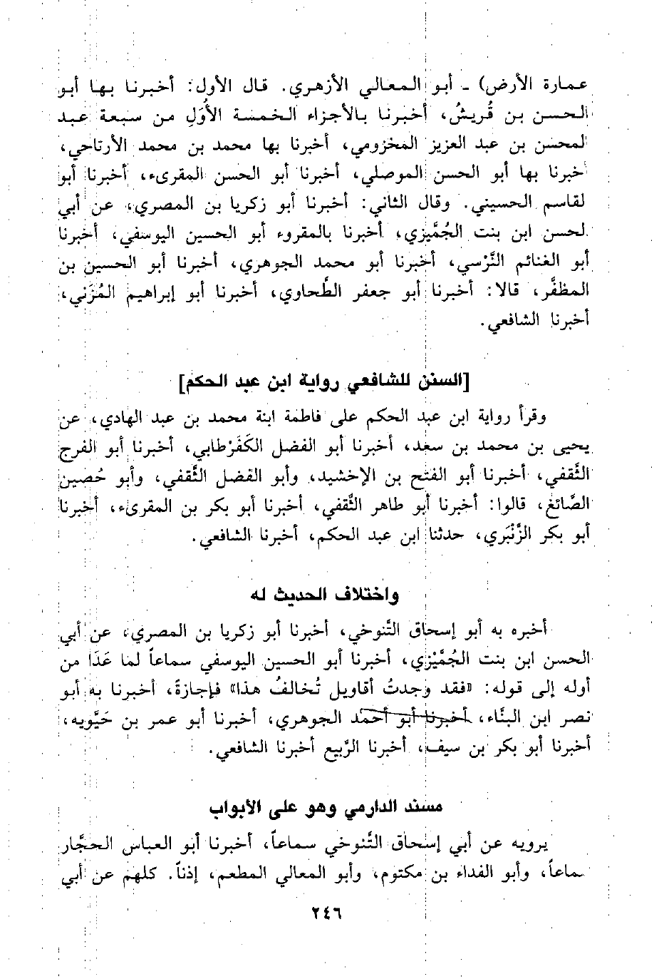 عمارة الأرض) - أبو المعالي الأزهري. قال الأول: أخبرنا بها أبو نلحسن بن قُريشُ، أخبرنا بالأجزاء الخمسة الأُوَلِ من سبعة عبد المحسن بن عبد العزيز المخزومي، أخبرنا بها محمد بن محمد الأرتاحي، أخبرنا بها أبو الحسن الموصلي، أخبرنا أبو الحسن المقرىء، أخبرنا أبو القاسم الحسيني. وقال الثاني: أخبرنا أبو زكريا بن المصري، عن أبي الحسن ابن بنت الجُمَّيزي، أخبرنا بالمقروء أبو الحسين اليوسفي، أخبرنا أبو الغنائم النَّرْسي، أخبرنا أبو محمد الجوهري، أخبرنا أبو الحسين بن المظفَّر، قالا: أخبرنا أبو جعفر الطَّحاوي، أخبرنا أبو إبراهيم المُزَني، أخبرنا الشافعي.