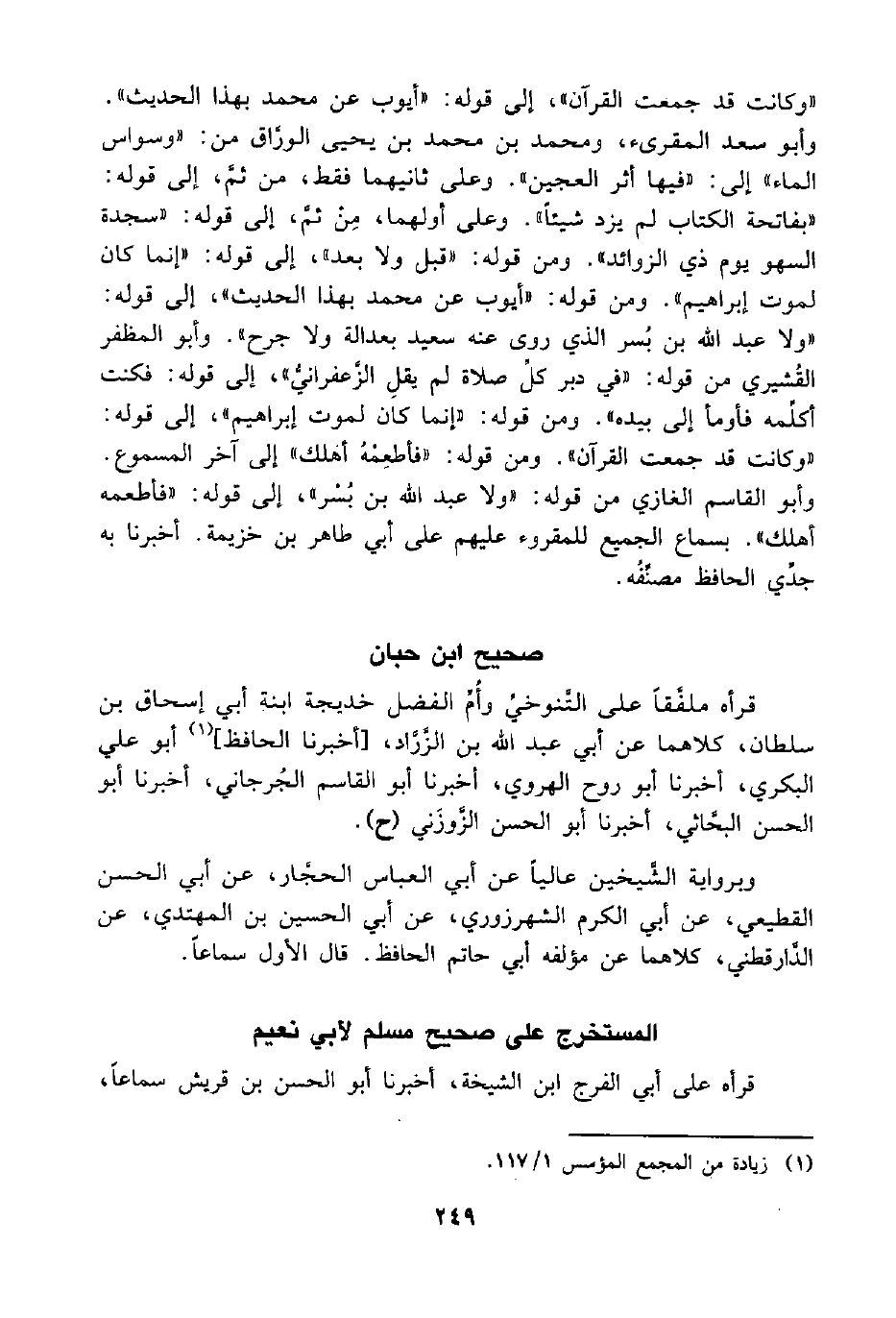 "وكانت قد جمعت القرآن"، إلى قوله: "أيوب عن محمد بهذا الحديث". وأبو سعد المقرىء، ومحمد بن محمد بن يحيى الورَّاق من: "وسواس الماء" إلى: "فيها أثر العجين". وعلى ثانيهما فقط، من ثمَّ، إلى قوله: "بفاتحة الكتاب لم يزد شيئًا". وعلى أولهما، مِنْ ثمَّ، إلى قوله: "سجدة السهو يوم في الزوائد". ومن قوله: "قبل ولا بعد"، إلى قوله: "إنما كان لموت إبراهيم". ومن قوله: "أيوب عن محمد بهذا الحديث"، إلى قوله: "ولا عبد اللَّه بن بُسر الذي روى عنه سعيد بعدالة ولا جرح". وأبو المظفر القُشيري من قوله: "في دبر كلِّ صلاة لم يقلِ الزَّعفرانيُّ"، إلى قوله: فكنت أكلِّمه فأومأ إلي بيده". ومن قوله: "إنما كان لموت إبراهيم"، إلى قوله: "وكانت قد جمعت القرآن". ومن قوله: "فأطعِمْهُ أهلك" إلى آخر المسموع. وأبو القاسم الغازي من قوله: "ولا عبد اللَّه بن بُسْر"، إلى قوله: "فأطعمه أهلك". بسماع الجميع للمقروء عليهم على أبي طاهر بن خزيمة. أخبرنا به جدِّي الحافظ مصنَّفُه.