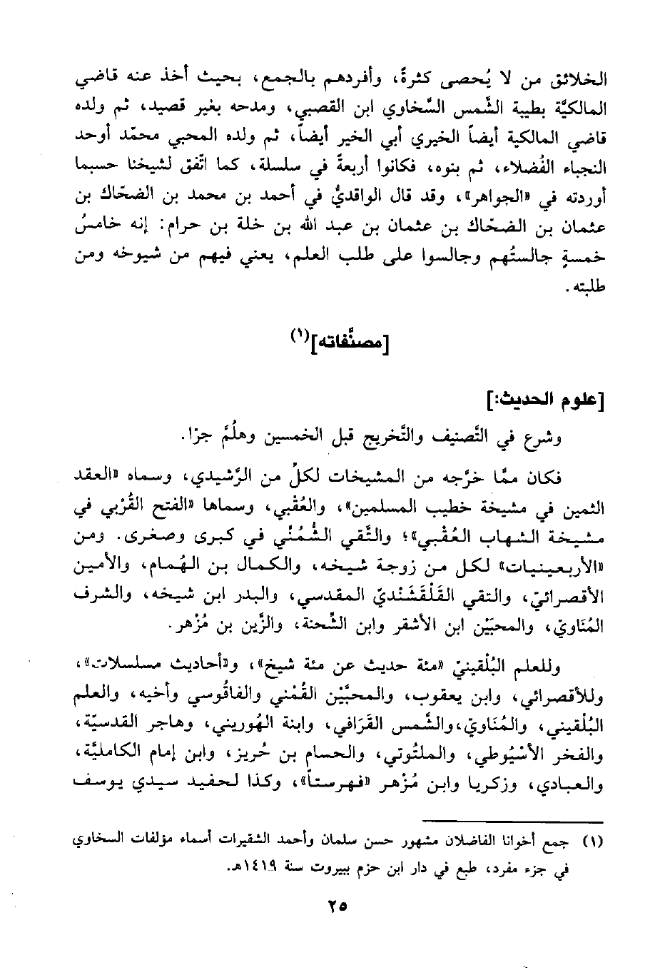 (¬1) جمع أخوانا الفاضلان مشهور حسن سلمان وأحمد الشقيرات أسماء مؤلفات السخاوي في جزء مفرد، طبع في دار ابن حزم ببيروت سنة 1419 هـ.