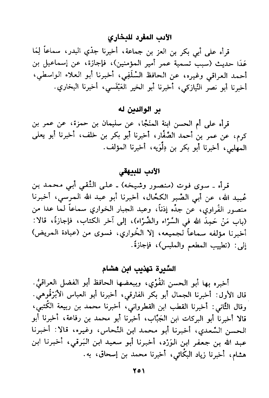 قرأه -سوى فوت (منصور وشيخه) - على التَّقي أبي محمد بن عُبيد اللَّه، عن أبي الصَّبر الكحَّال، أخبرنا أبو عبد اللَّه المرسي، أخبرنا منصور الفُراوي، عن جدِّه إذنًا، وعبد الجبار الخواري سماعًا لما عدا من (باب مَنْ حَمِدَ اللَّه في السَّرَّاء والضَّرَّاء)، إلى آخر الكتاب, فإجازةً، قالا: أخبرنا مؤلفه سماعًا لجميعه، إلا الخُواري، فسوى من (عيادة المريض) إلى: (تطييب المطعم والملبس)، فإجازةً.
