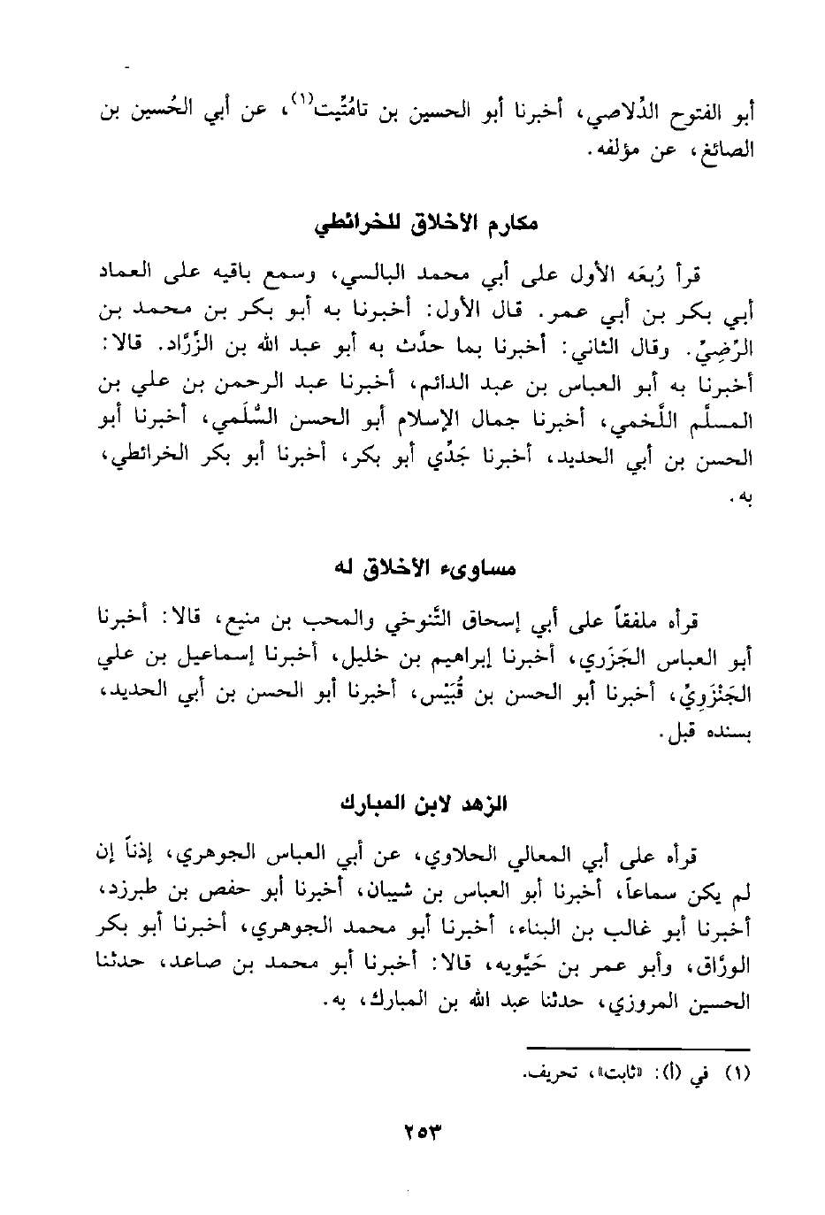 قرأه على أبي المعالي الحلاوي، عن أبي العباس الجوهري، إذنًا إن لم يكن سماعًا، أخبرنا أبو العباس بن شيبان، أخبرنا أبو حفص بن طبرزد، أخبرنا أبو غالب بن البناء، أخبرنا أبو محمد الجوهري، أخبرنا أبو بكر الورَّاق، وأبو عمر بن حَيَّويه، قالا: أخبرنا أبو محمد بن صاعد، حدثنا الحسين المروزي، حدثنا عبد اللَّه بن المبارك، به.