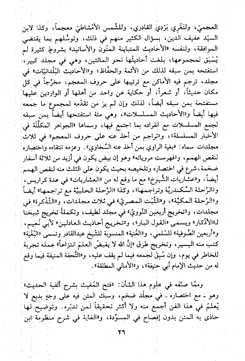 العجميّ، ولتَغْرِي بَرْدِي لقادري، وللشَّمس الأَمْشاطيّ معجمًا، وكذا لابن السيّد عفيف الدين، بسؤال الكثير منهم في ذلك، وتوسُّلهم بما يقتضي الموافقة، ولنفسه "الأحاديث المتباينة المتُون والأسانيد" بشروطٍ كثيرة لم يُسْبَق لمجموعها، بلغت أحاديثُها نحو المائتين، وهي في مجلد كبير، استفتحه بمن سبقه لذلك من الأئمة والحفَّاظ؛ و"الأحاديث البُلْدانيّات" في مجلد، ترجم فيه الأماكن مع ترتيبها على حروف المعجم، مخرِّجًا في كل مكان حديثًا، أو شعرًا، أو حكاية عن واحد من أهلها أو الواردين عليها مستفتحة بمن سبقه أيضًا، لذلك وإن لم يرَ من تقدّمه لمجموع ما جمعه فيها أيضًا و"الأحاديث المسلسلات"، وهي مئة استفتحها أيضًا بمن سبقه لجمع المسلسلات مع انفراده بما اجتمع فيها، وسماها "الجواهر المكلَّلَة في الأخبار المسلسلة"، و"تراجم من أخذ عنه على حروف المعجم" في ثلاث مجلدات سماه: "بغية الراوي بمن أخذ عنه السَّخاوي". وعزمه انتقاءه واختصاره لنقص الهمم، و"فهرست مروياته" وهو إن بيض يكون في أزيد من ثلاثة أسفار ضخمة، شرع في اختصاره وتلخيصه بحيث يكون على الثلث منه لنقص الهمم أيضًا، و"عشاريات الشُّيوخ" مع ما وقع له من "العشريات" في عدة كراريس، و"الرِّحلة السِّكندريَّة وتراجمها"، وكذا "الرِّحلة الحلبيّة مع تراجمها" أيضًا و"الرِّحلة المكيَّة"، و"الثَّبْت المصريّ" في ثلاث مجلدات، و"التَّذْكرة" في مجلدات، و"تخريج أربعين النَّوويّ" في مجلد لطيف، وتكملةُ تخريج شيخنا لـ "الأذْكار" ويسمى "القول البار"، و"تخريج أحاديث العادلين" لأبي نُعيم، و"أربعين الصُّوفية" للسّلمي، و"الغُنية" المنسوبة للشيخ عبد القادر وتسمى "البُغْيَة" كتب منه اليسير، وتخريج طرق "إنَّ اللَّه لا يقبضُ العلمَ انتزاعًا" عمله تجربة للخاطر في يوم، وإن سُبِقَ لجمعه فيما لم يقف عليه، و"التُّحفة المنيفة فيما وقع له من حديث الإمام أبي حنيفة"، و"الأمالي المطلقة".