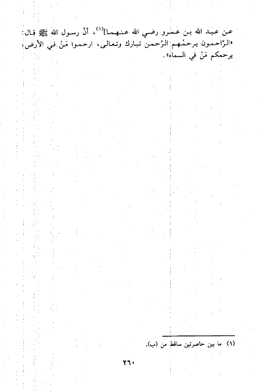 عن عبد اللَّه بن عمرو رضي اللَّه عنهما] (¬1)، أنَّ رسول اللَّه -صلى اللَّه عليه وسلم- قال: "الرَّاحمون يرحمُهم الرَّحمن تبارك وتعالى، ارحموا مَنْ في الأرض، يرحمكم مَنْ في السماء".