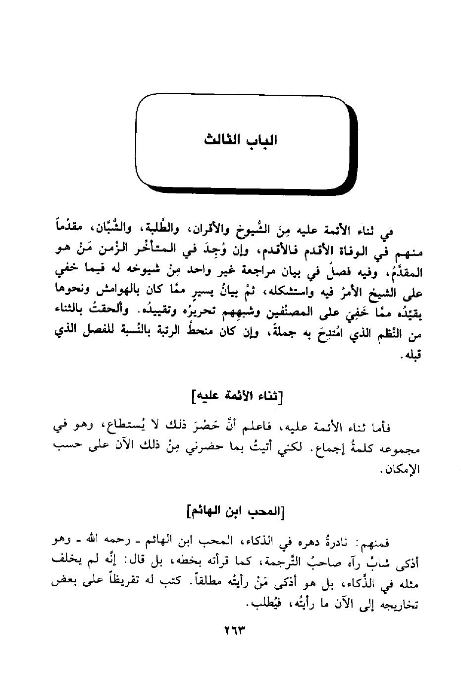 في ثناء الأئمة عليه مِنَ الشُّيوخ والأقران، والطَّلبة، والشُّبَّان، مقدِّمًا منهم في الوفاة الأقدم فالأقدم، وإن وُجِدَ في المتأخِّر الزَّمن مَنْ هو المقدَّمُ، وفبه فصلٌ في بيان مراجعة غير واحد مِنْ شيوخه له فيما خفي على الشيخ الأمرُ فيه واستشكله، ثمَّ بيانُ يسيير ممَّا كان بالهوامش ونحوها يقيِّدُه ممَّا خَفِيَ على المصنِّفين وشبهِهم تحريرُه وتقييدُه. وألحقتُ بالثناء من النَّظم الذي امُتدِحَ به جملة، وإن كان منحطَّ الرتبة بالنِّسبة للفصل الذي قبله.