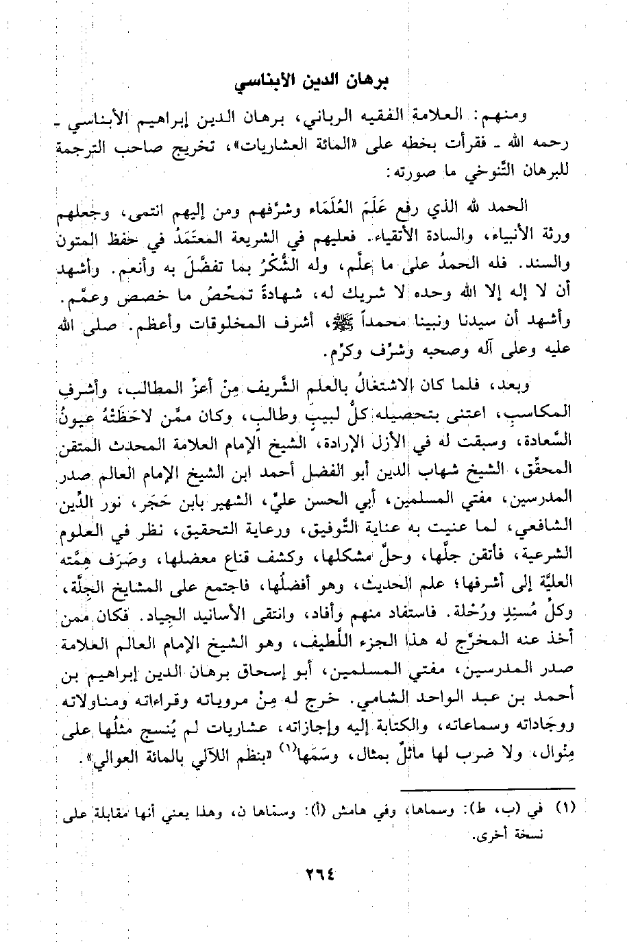 ومنهم: العلامة الفقيه الرباني، برهان الدين إبراهيم الأبناسي -رحمه اللَّه- فقرأت بخطه على "المائة العشاريات"، تخريج صاحب الترجمة للبرهان التَّنوخي ما صورته: