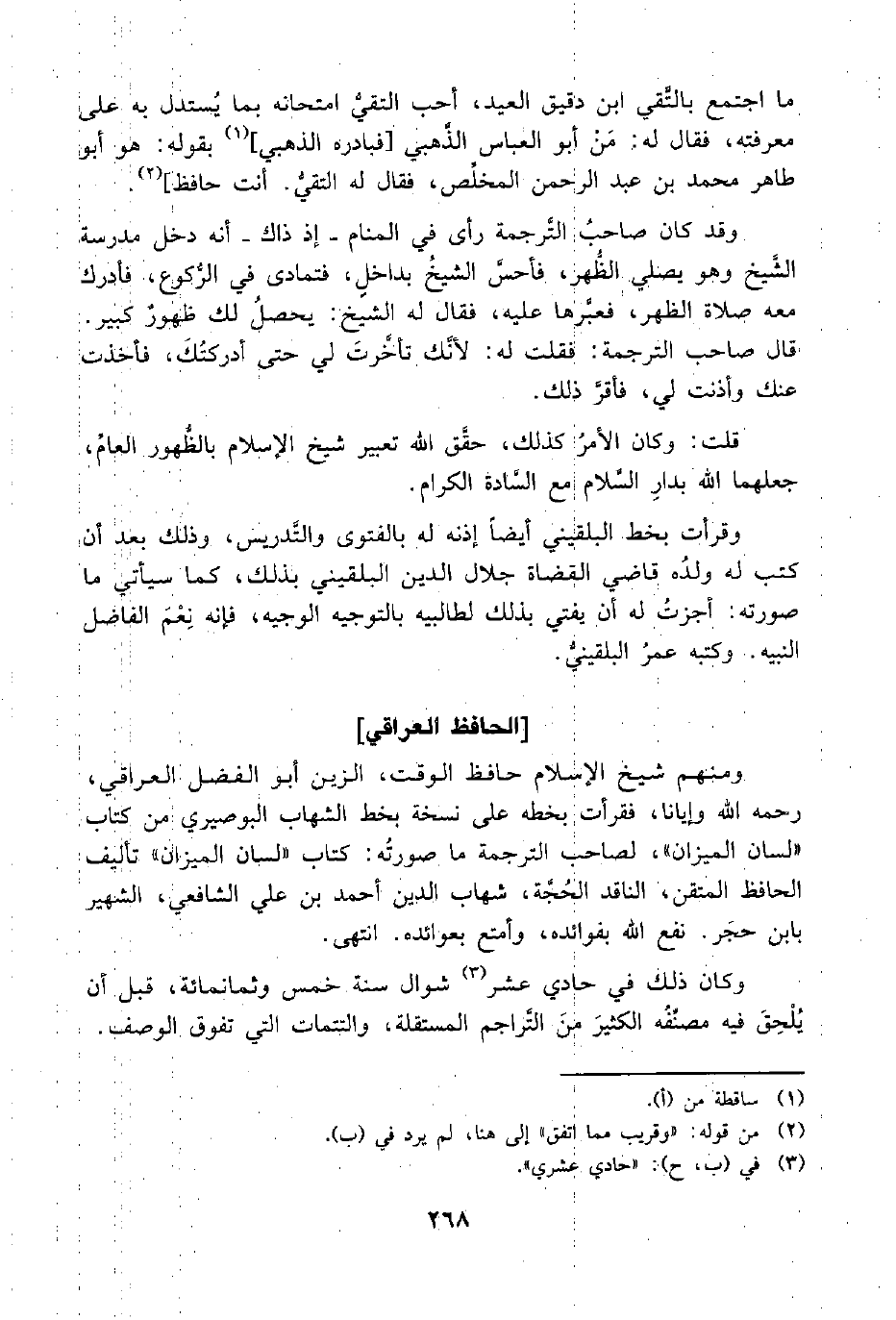 ومنهم شيخ الإسلام حافظ الوقت، الزين أبو الفضل العراقي، رحمه اللَّه وإيانا، فقرأت بخطه على نسخة بخط الشهاب البوصيري من كتاب "لسان الميزان"، لصاحب الترجمة ما صورتُه: كتاب "لسان الميزان" تأليف الحافظ المتقن، الناقد الحُجَّة، شهاب الدين أحمد بن علي الشافعي، الشهير بابن حجَر. نفع اللَّه بفوائده، وأمتع بعوائده. انتهى.
